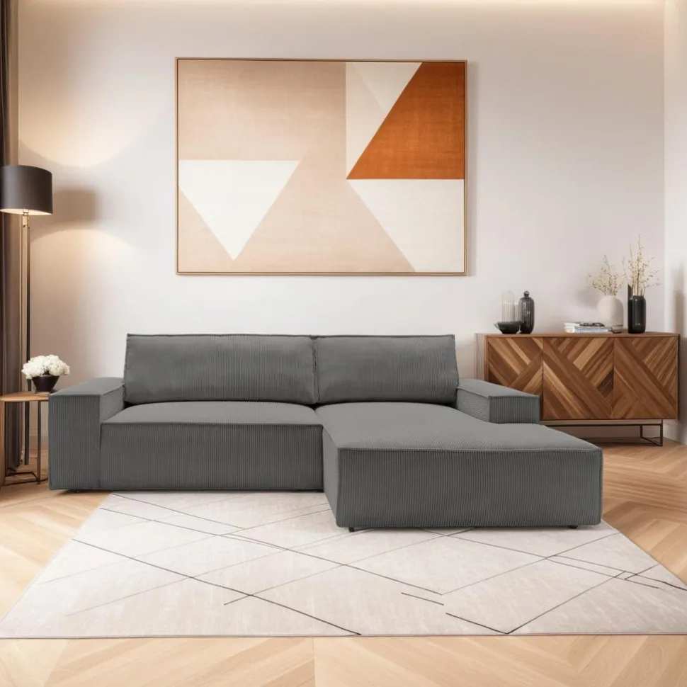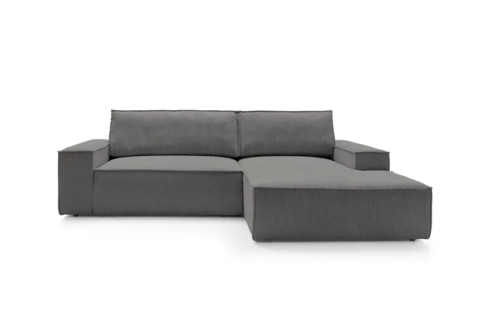 Molde M to duży, elegancki narożnik, który idealnie wpasuje się w każde wnętrze dzięki swojemu uniwersalnemu, szaremu kolorowi. Wykonany z miękkiej, sztruksowej tkaniny, zapewnia niezwykły komfort podczas codziennego wypoczynku. Wyjątkowy, minimalistyczny kształt narożnika, w połączeniu z grubym, 28 cm podłokietnikiem, sprawia, że jest to mebel nie tylko praktyczny, ale i stylowy. Dodatkowym atutem jest szezlong zakończony poduchą, do której możemy się oprzeć, czytając ulubioną książkę czy oglądając film.