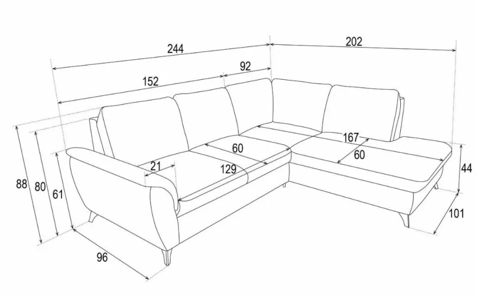 - Narożnik Nevada z funkcją spania prawy beżowy Loop 8 GR3 to mebel o wymiarach 244 cm szerokości i 44 cm wysokości siedziska.