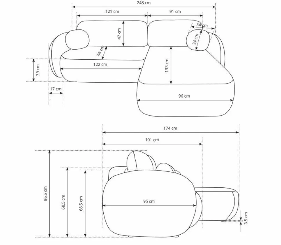 - Mebel o wymiarach 248x39cm, z podłokietnikami o wysokości 68,5cm