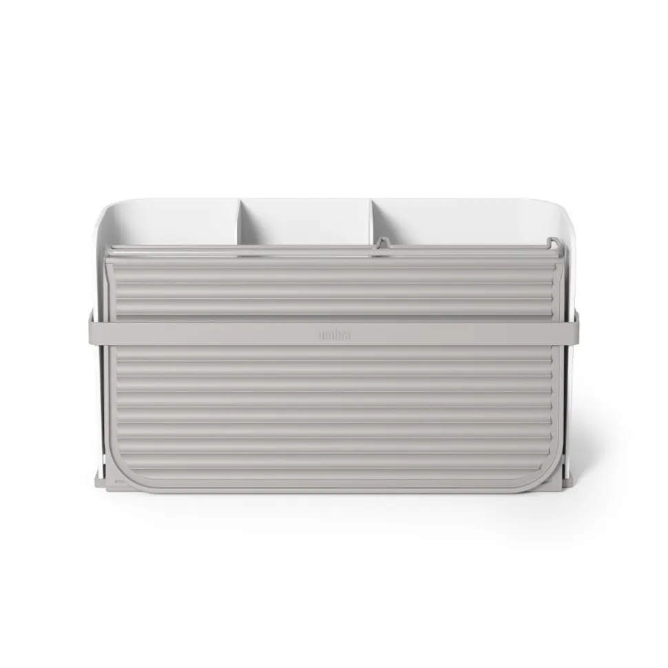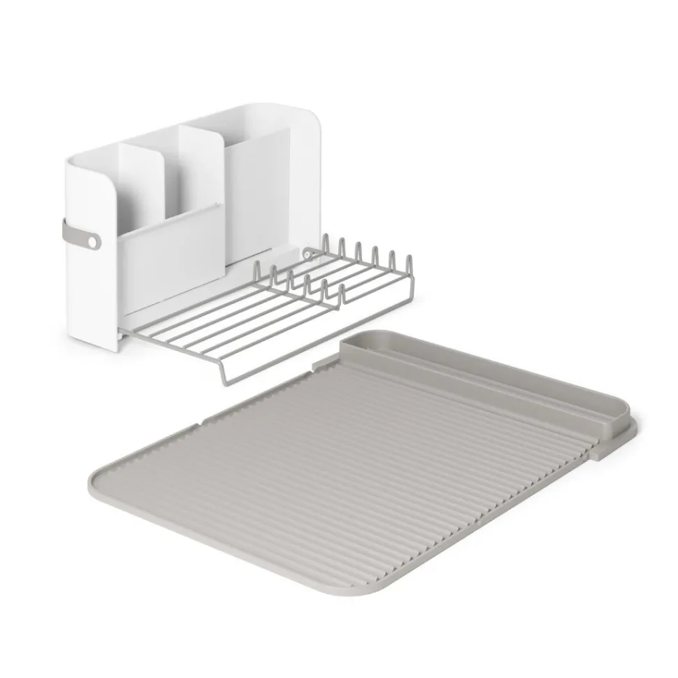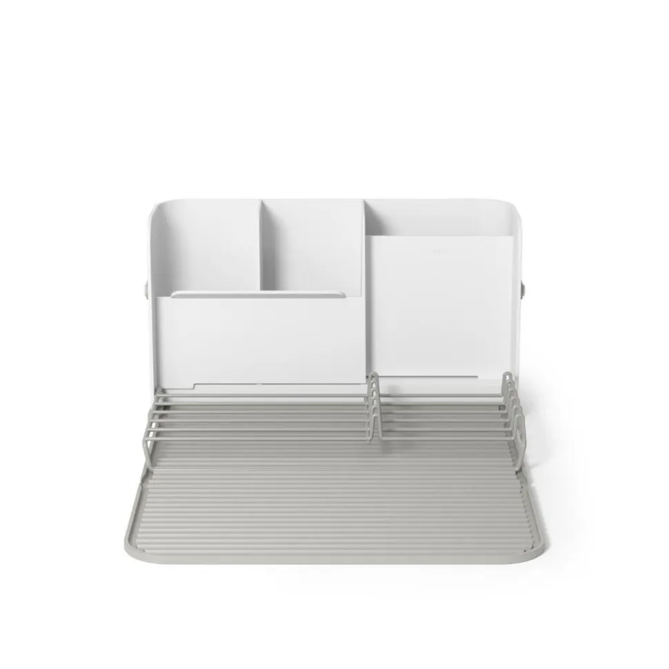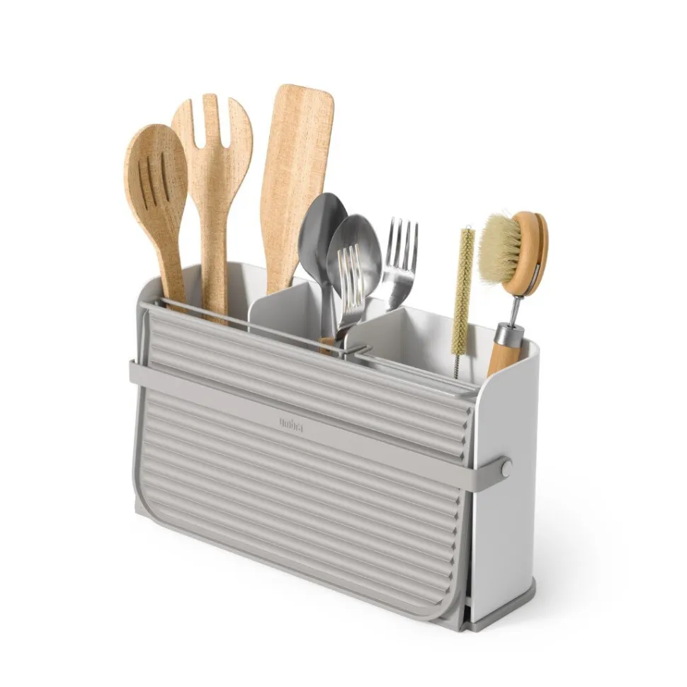 SLING posiada metalowy składany stojak oraz składaną matę. Podstawa wyposażona jest w trzy podzielone sekcje: do organizacji sztućców, dużych przyborów kuchennych oraz do czyszczenia naczyń, takich jak gąbki czy szczotki. Praktyczny i funkcjonalny ociekacz nie tylko zwiększa wydajność w kuchni, ale także jest przenośny i łatwy w przechowywaniu. Możesz go łatwo złożyć, gdy nie jest używany.
