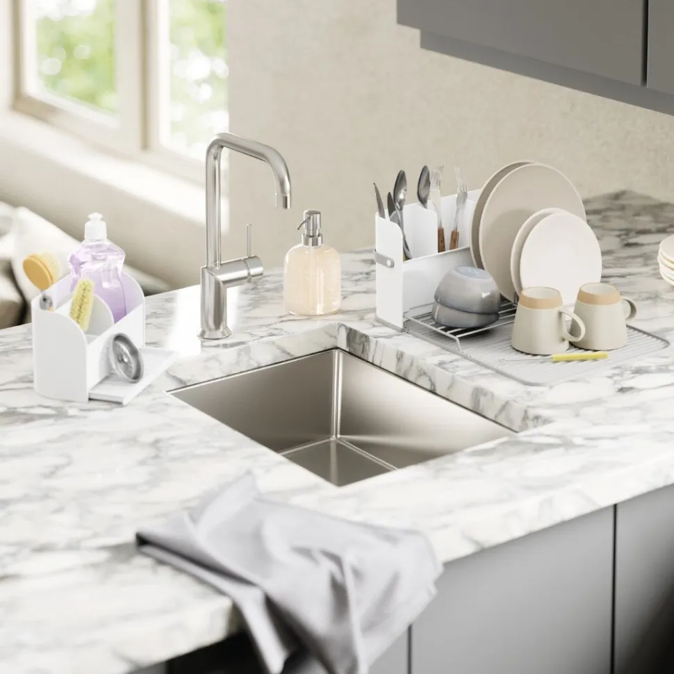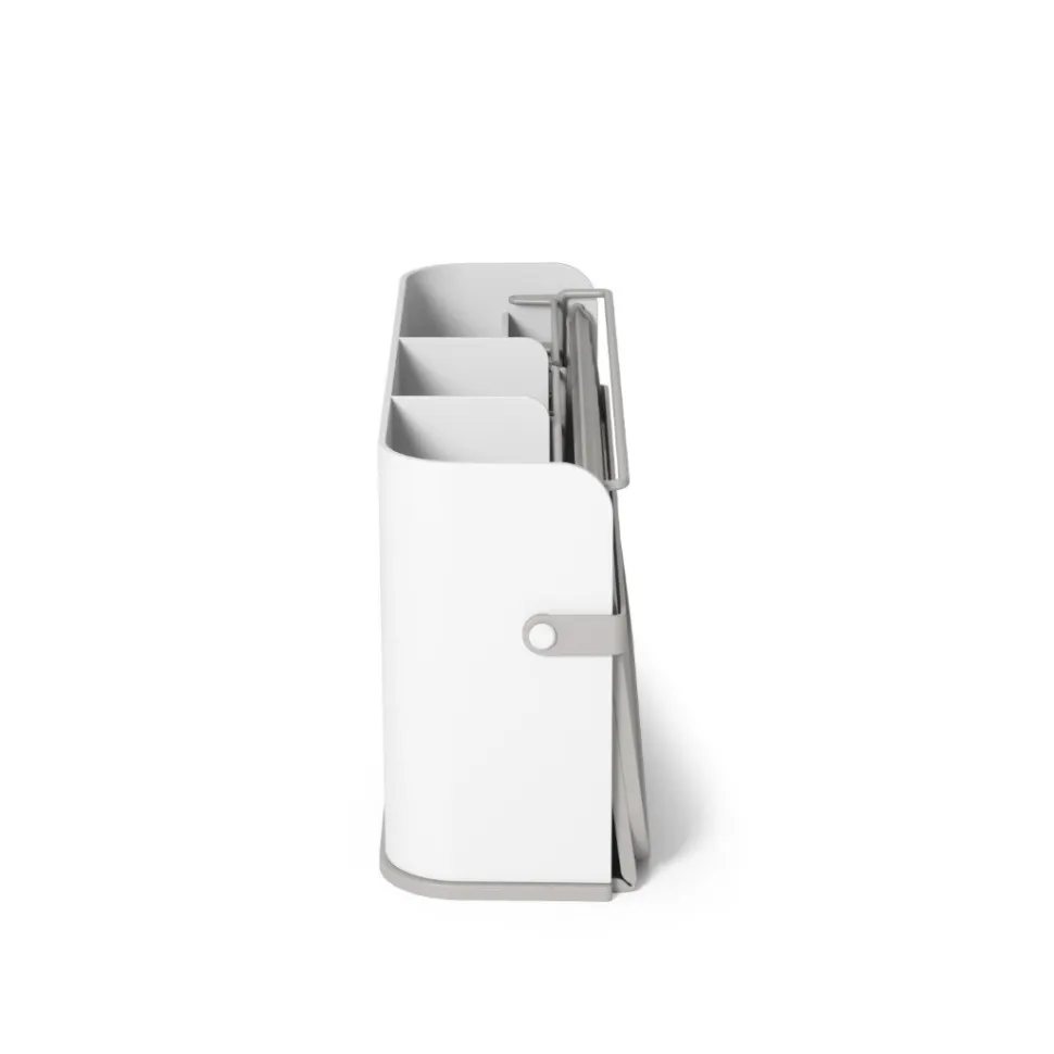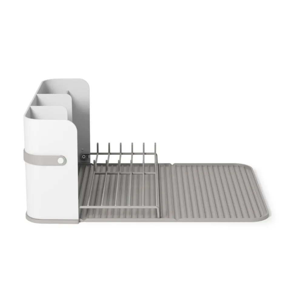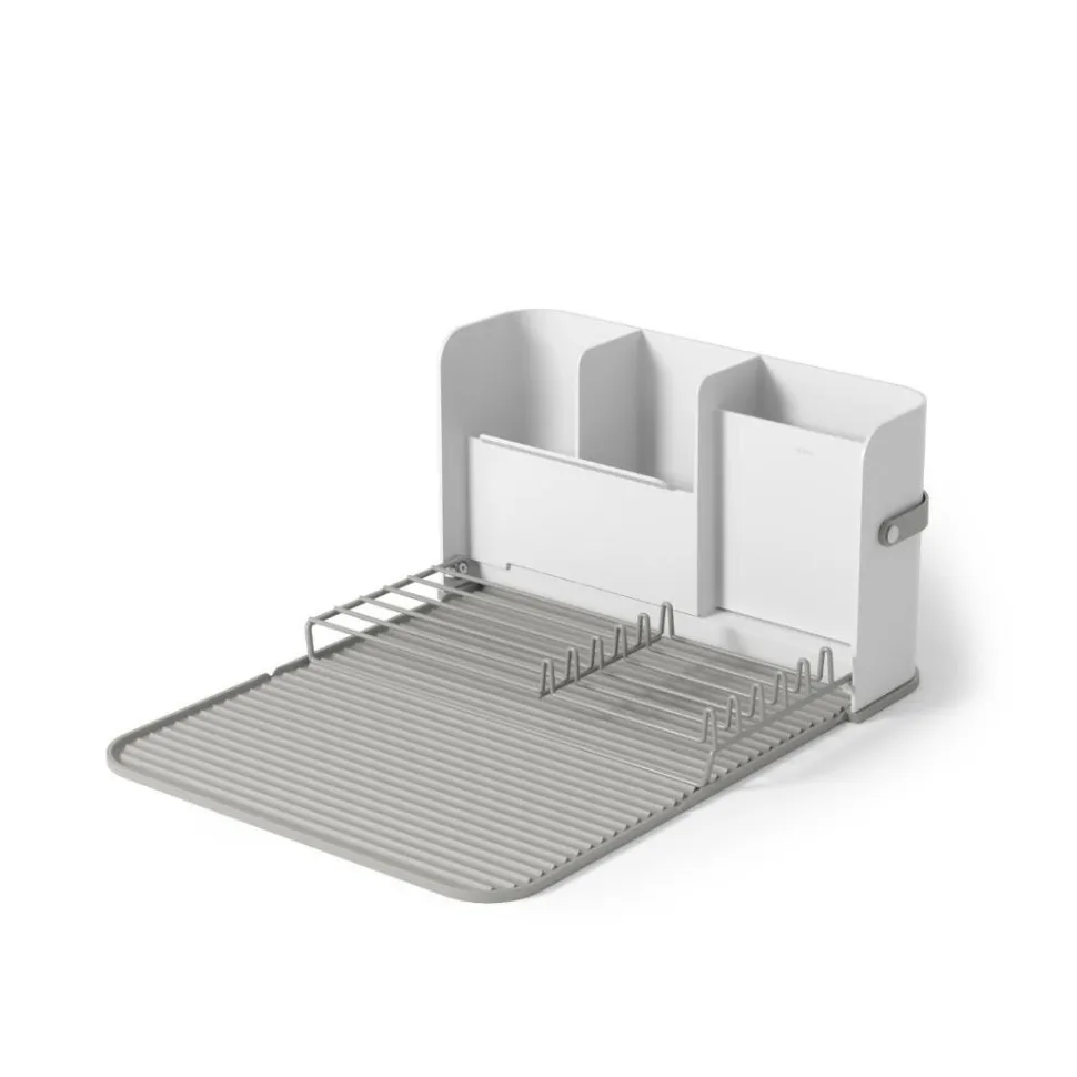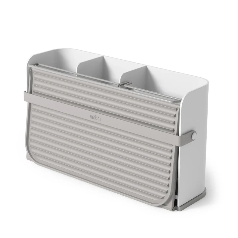 SLING posiada metalowy składany stojak oraz składaną matę. Podstawa wyposażona jest w trzy podzielone sekcje: do organizacji sztućców, dużych przyborów kuchennych oraz do czyszczenia naczyń, takich jak gąbki czy szczotki. Praktyczny i funkcjonalny ociekacz nie tylko zwiększa wydajność w kuchni, ale także jest przenośny i łatwy w przechowywaniu. Możesz go łatwo złożyć, gdy nie jest używany.