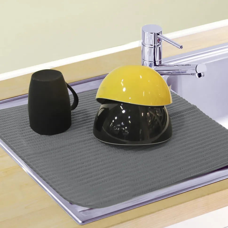 Idealne rozwiązanie dla małych kuchni, materiałowy ociekacz do naczyń Intesi wygodnie mieści się nad zlewami i blatami. Oszczędzająca miejsce mata wykonana jest z wytrzymałej tkaniny, która z łatwością wchłania nadmiar wody z talerzy lub szklanek, nie uszkadzając delikatnych dekoracji ani szkła.