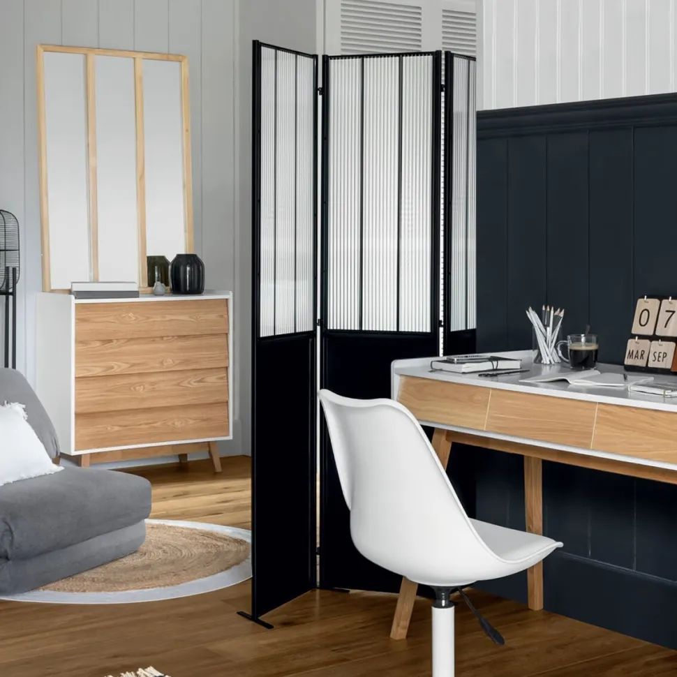 Zgodnie z trendem industrialnym, składany parawan Atelier przypomina drzwi warsztatowe, wprowadzając wyjątkowy styl do każdego pomieszczenia. Wykonany z żelaza i szkła hartowanego, parawan łączy w sobie funkcjonalność z estetyką. Idealnie nadaje się do dzielenia przestrzeni w mieszkaniu bez konieczności przeprowadzania skomplikowanych prac remontowych. Jego stonowane linie i fabryczny wygląd dodają wnętrzom charakteru, a jednocześnie pozostają eleganckie i nowoczesne.