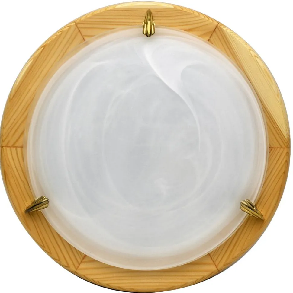 - Plafon wykonany z certyfikowanego drewna w kolorze sosny i szklanego klosza