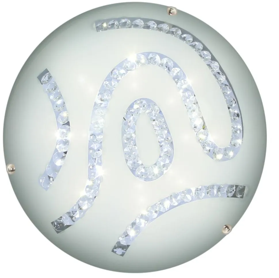 Plafon Gaja 30 1x10W LED 4000K to doskonałe połączenie klasyki z nowoczesnością. Wykonany z giętego szkła, które zostało poddane procesowi piaskowania, polerowania i malowania, by uzyskać unikalny, zdobiony wzór. Zewnętrzna strona klosza jest polerowana, co dodaje mu blasku i elegancji. Plafon ozdobiony jest ręcznie doklejanymi kryształkami, które w połączeniu z delikatnie ciepłym światłem LED tworzą niepowtarzalny efekt.