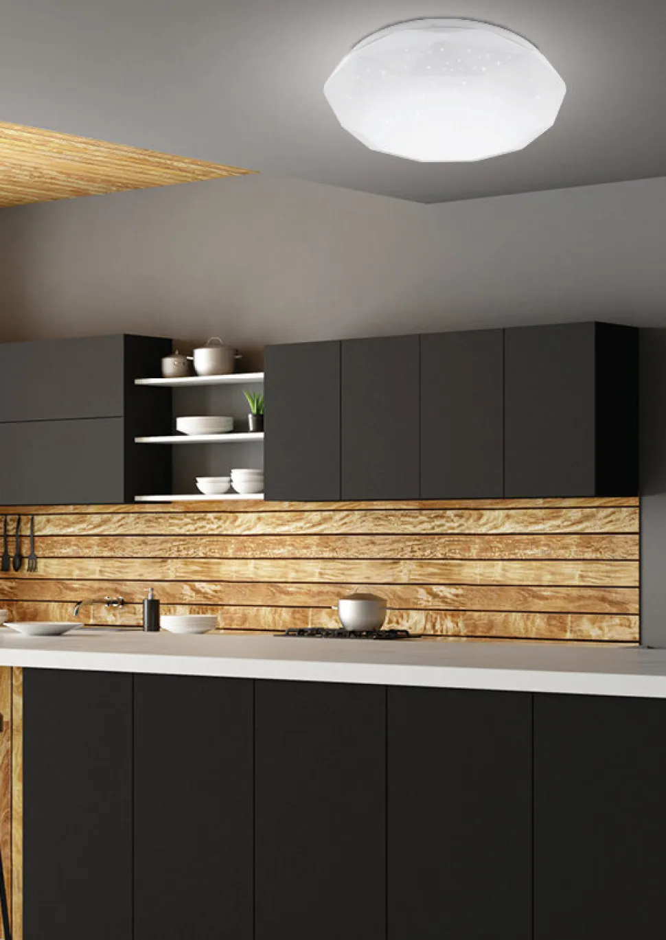 - Dzięki uniwersalnemu białemu kolorowi i efektowi gwiezdnego nieba doskonale wpasuje się w każde wnętrze.