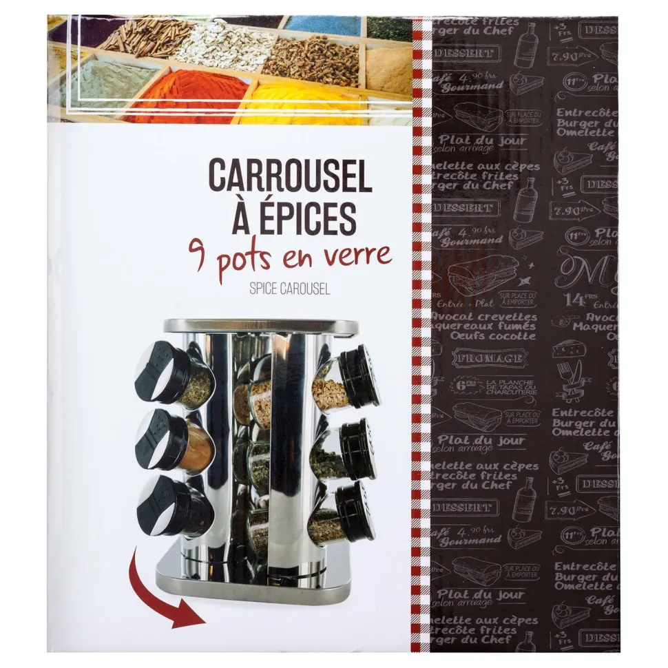 Zorganizuj się w kuchni i ułatw sobie przygotowywanie posiłków dzięki temu obrotowemu pojemnikowi na przyprawy. Metalowy stojak mieści dziewięć pojemników wykonanych z połączenia szkła i plastiku. Każdy pojemnik ma otwieraną pokrywę dla wygodnego dozowania. Carousel to mnóstwo miejsca do przechowywania na swoje ulubione przyprawy. Wprowadź wygodę do swojego domu już dziś z pojemnikiem na przyprawy Carousel od Intesi!