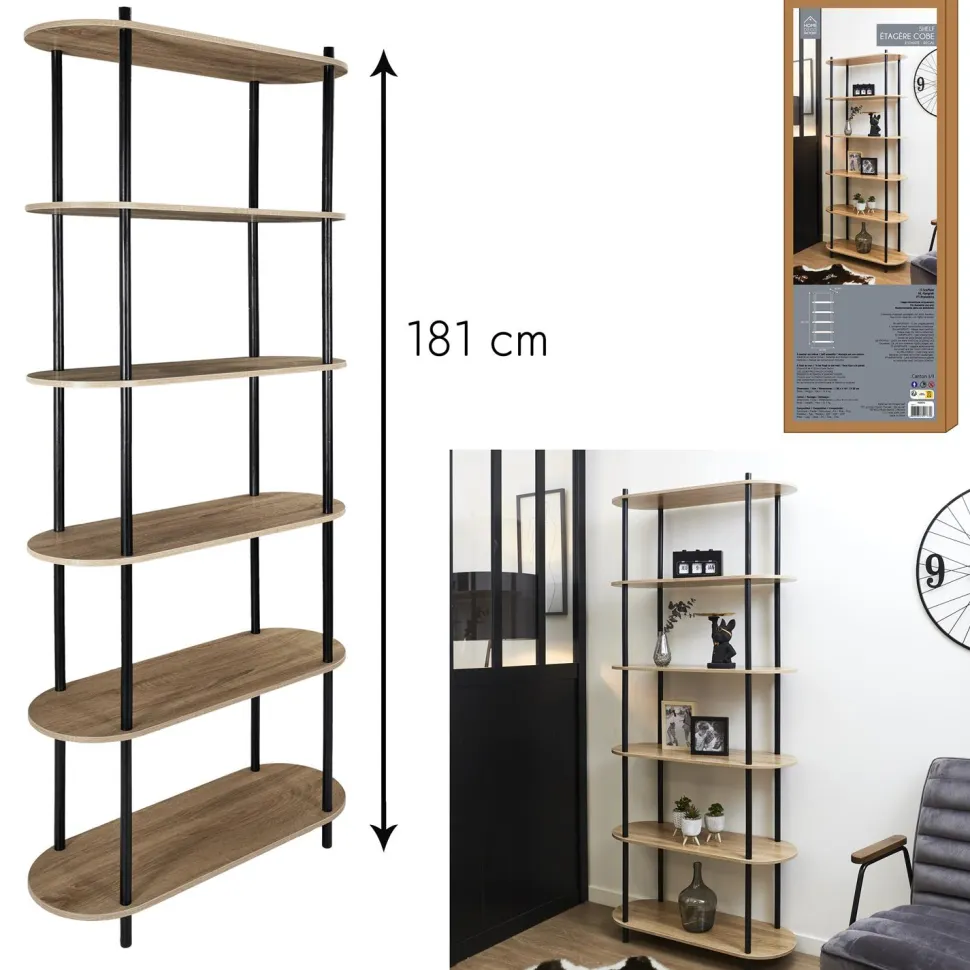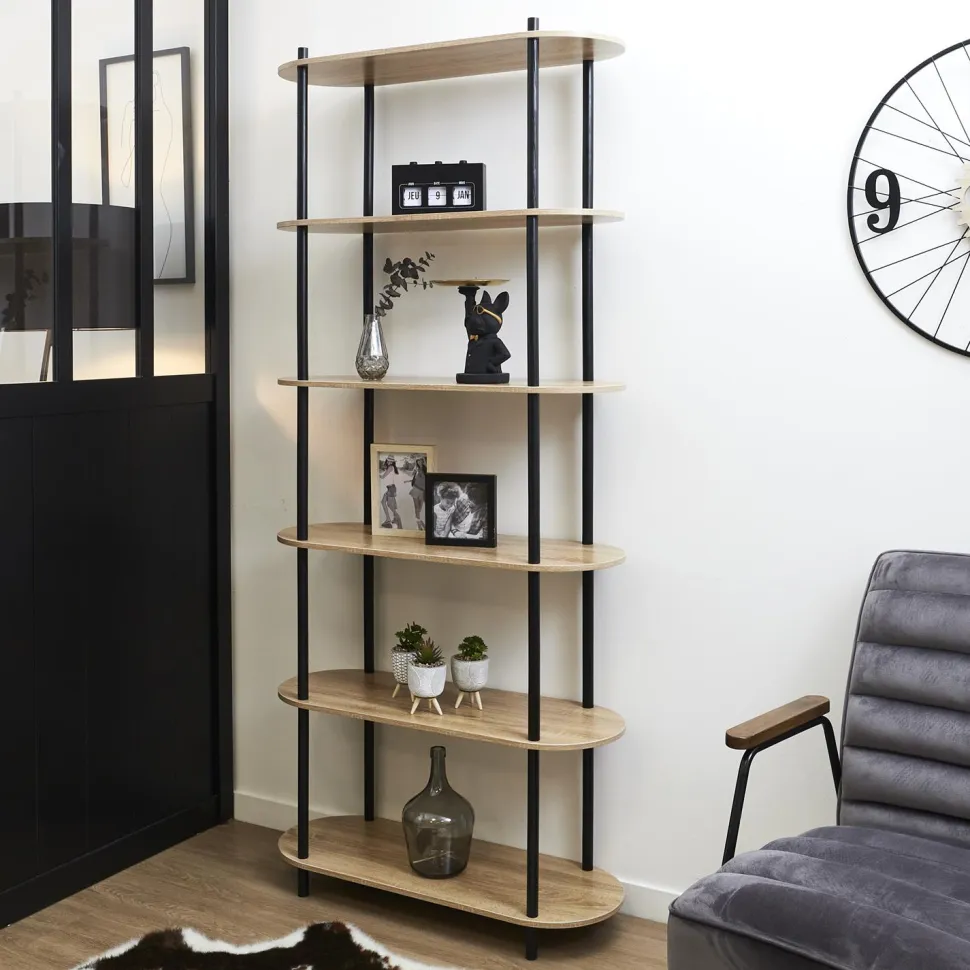 Czarny stelaż z drewna sosnowego, polakierowany na wysoki połysk, nadaje regałowi eleganckiego wyglądu, który doskonale kontrastuje z półkami w okleinie imitującej dąb. Zaokrąglone krawędzie półek nawiązują do trendowego stylu japandi, dodając wnętrzu subtelnej delikatności i harmonii.