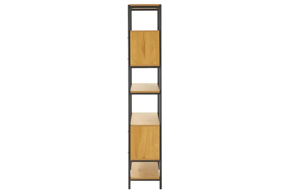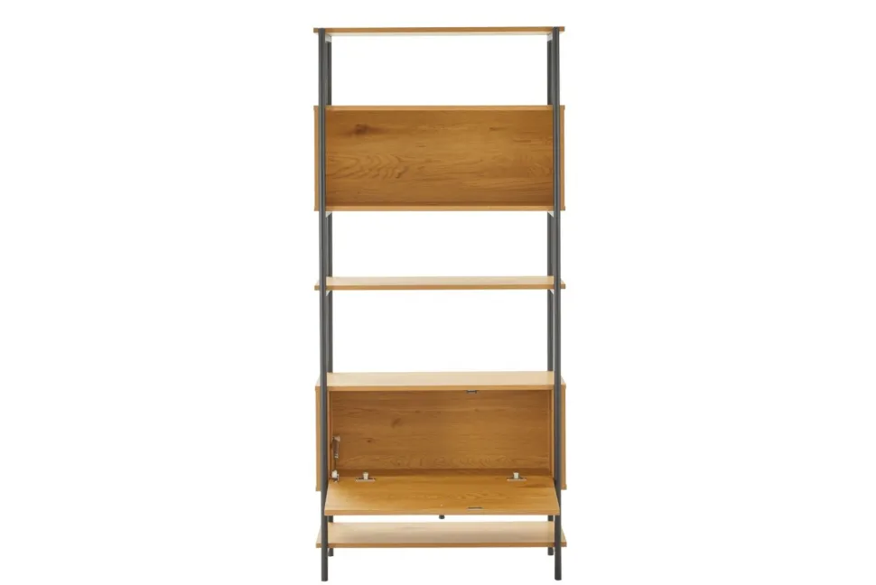 Ten wysoki regał vintage oferuje wiele miejsca na przechowywanie różnorodnych przedmiotów dzięki pięciu półkom i szafce z zamykanym frontem. Możesz bez trudu przechowywać na nim książki, dekoracje, czy inne drobiazgi, zachowując porządek w swoim domu. Półki i fronty regału wykonane są z MDF z okleiną imitującą dąb, co dodaje mu szlachetnego wyglądu. Montaż regału jest prosty i szybki, dzięki czemu w krótkim czasie będziesz mógł cieszyć się jego funkcjonalnością.