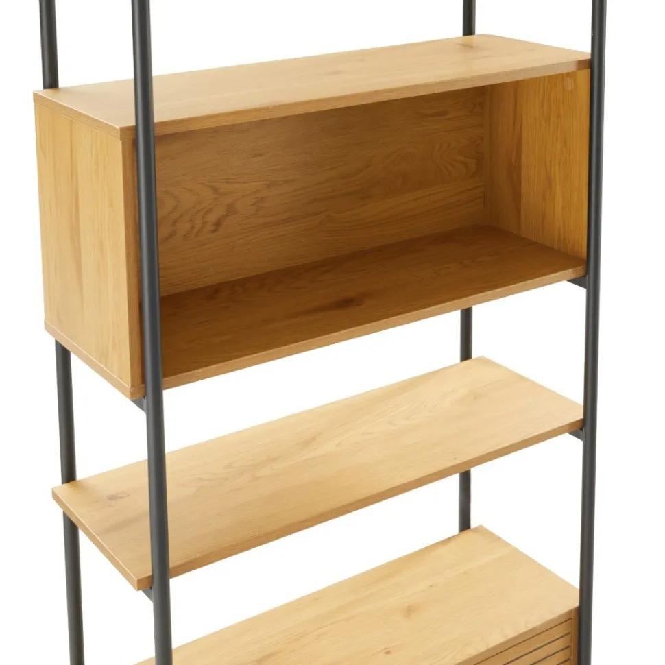 Regał Lattes dąb to doskonałe połączenie funkcjonalności i elegancji, które idealnie wpasuje się w każde stylowe wnętrze. Dzięki swojej solidnej konstrukcji z metalowymą podstawą malowaną proszkowo na czarno, regał jest nie tylko trwały, ale także nadaje pomieszczeniu industrialnego charakteru.