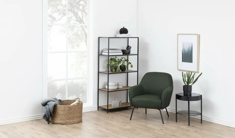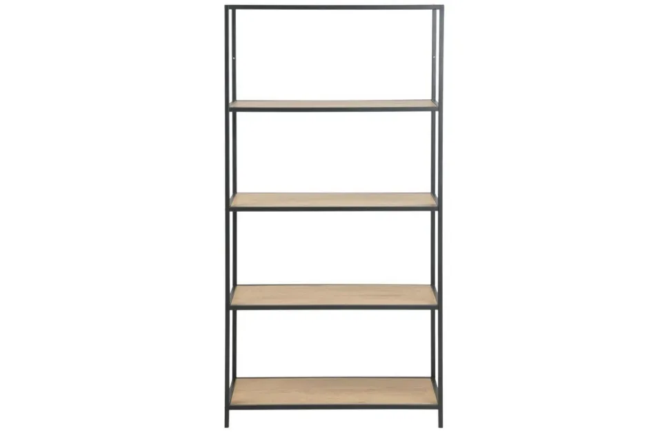 Regał Seaford IX stworzony został w ponadczasowym kształcie minimalistycznej bryły. Jego loftowy design świetnie podkreśli charakter wnętrza salonu, jednocześnie oferując dużą wygodę użytku. Proste, duże półki zmieszczą na sobie wiele przedmiotów takich jak zdjęcia, naczynia, czy rośliny. Idealnie nada się on również do przechowywania książek czy płyt. Stelaż zrobiony jest z proszkowanego na czarno metalu, na którym umieszczone są półki z płyty MDF pokrytej okleiną dębową.