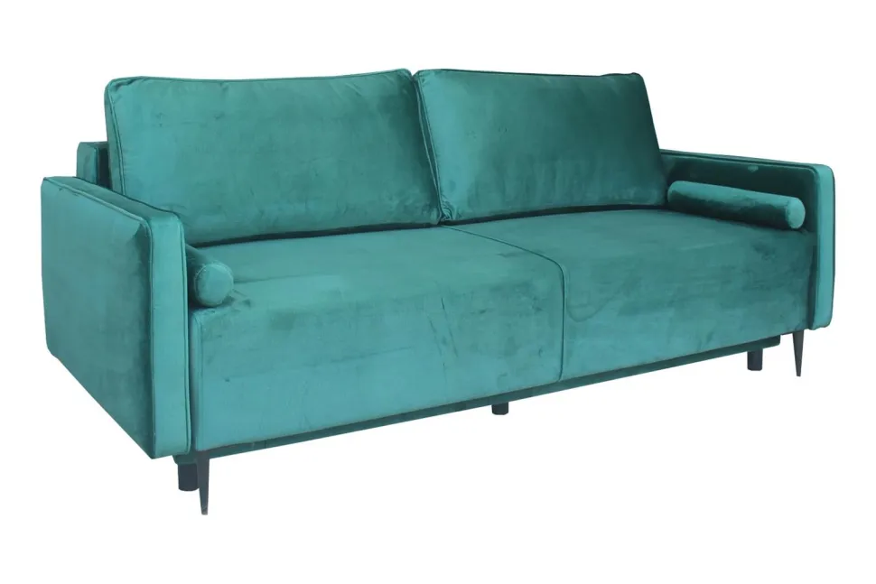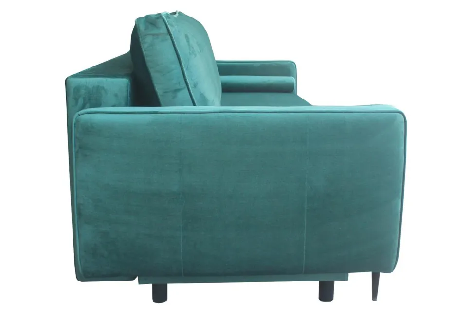 Składa się z tapicerowanego siedziska z podłokietnikami, które wypełnia pianka T30 charakteryzująca się dużym stopniem gęstości. Uzupełniona dodatkowo sprężynami falistymi zapewnia bardzo dobrą sprężystość i doskonałą twardość, która zapobiega odkształcaniu się powierzchni. Całość spoczywa na czarnej podstawie z pięciu drewnianych nóg oraz dwóch dodatkowych z metalu, które wspierają rozkładaną część sofy. Aby zapewnić jeszcze większą wygodę, sofa rozkładana posiada dwie dodatkowe poduszki na oparciu oraz ozdobne wałki. Welwetowa tkanina w trzech dostępnych kolorach jest przyjemna w dotyku, trwała, a przy tym zapewnia doskonałe efekty wizualne. Zaokrąglone krawędzie usztywnione zostały dekoracyjną kedrą, która zapobiega odkształcaniu się miejsc brzegowych i zabezpiecza przez rozpruwaniem.