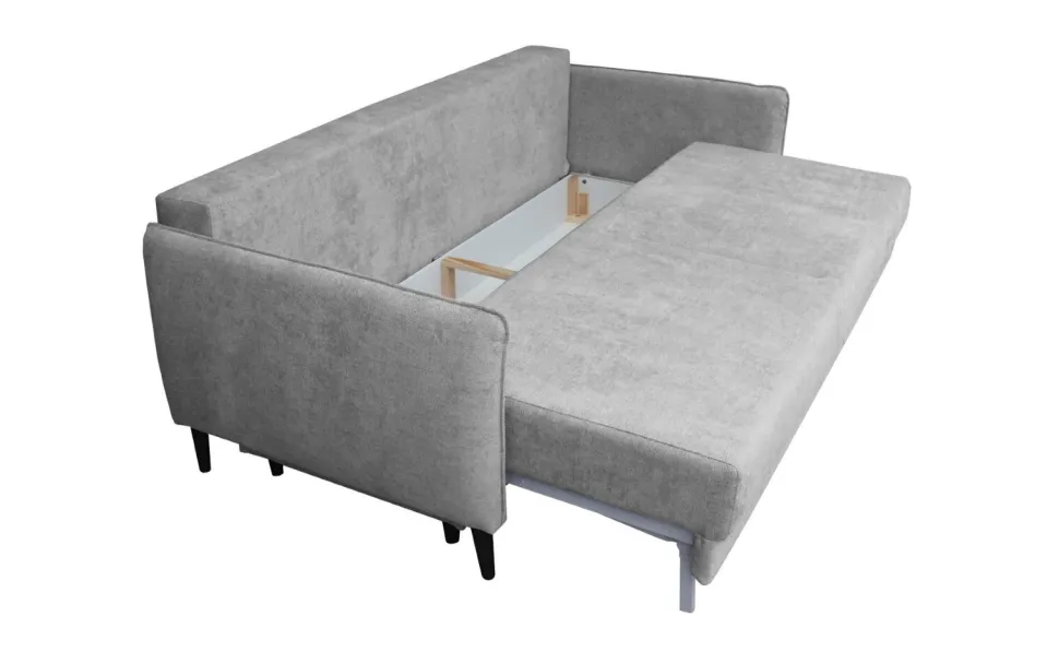 Sofa posiada również pojemnik na pościel, który jest niezwyklepraktycznym rozwiązaniem, zwłaszcza w małych mieszkaniach. Dzięki pojemnikowi na pościel, możemy szybko i łatwo schować kołdry, poduszki oraz inne akcesoria, co pozwala utrzymać porządek w salonie. Dodatkowo, sofa wyposażona jest w eleganckie, czarne nóżki wykonane z tworzywa, które nadają jej nowoczesnego wyglądu i zapewniają stabilność.