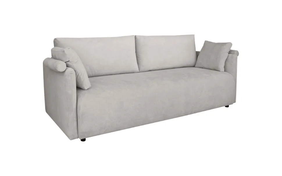Sofa posiada również pojemnik na pościel, który jest niezwykle praktycznym rozwiązaniem, zwłaszcza w małych mieszkaniach. Dzięki pojemnikowi na pościel, możemy szybko i łatwo schować kołdry, poduszki oraz inne akcesoria, co pozwala utrzymać porządek w salonie. Dodatkowo, sofa wyposażona jest w eleganckie, czarne nóżki wykonane z tworzywa, które nadają jej nowoczesnego wyglądu i zapewniają stabilność.