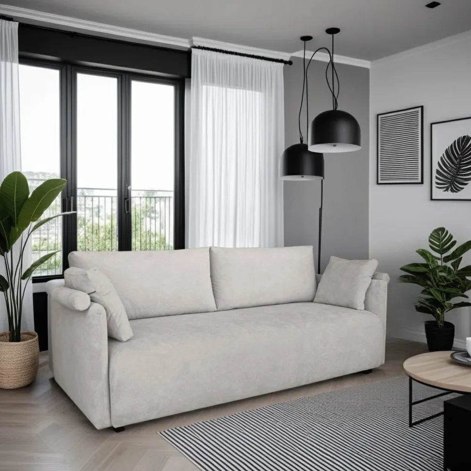 Sztruksowa sofa z funkcją spania to doskonały wybór dla osób poszukujących mebla, który łączy elegancję z funkcjonalnością. Sofa pokryta jest miękką, sztruksową tkaniną, która nie tylko przyciąga wzrok, ale także jest bardzo przyjemna w dotyku. Tkanina sztruksowa wprowadza do wnętrza ciepło i przytulność, dzięki czemu sofa staje się prawdziwą ozdobą salonu. Jej uniwersalny design sprawia, że będzie pasować zarówno do nowoczesnych, jak i bardziej klasycznych aranżacji.