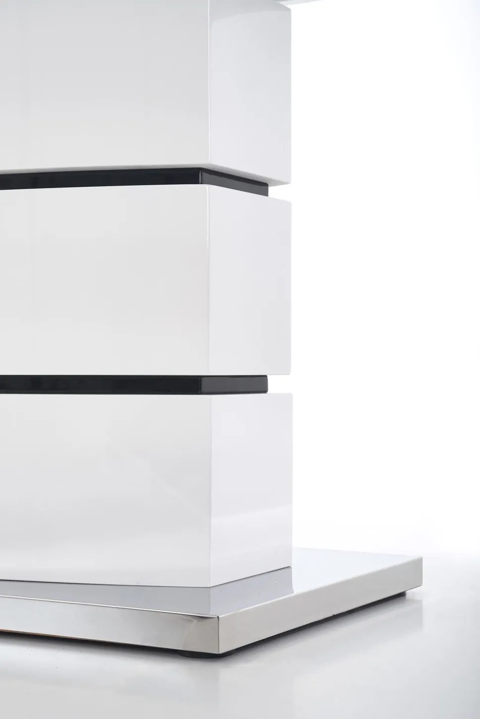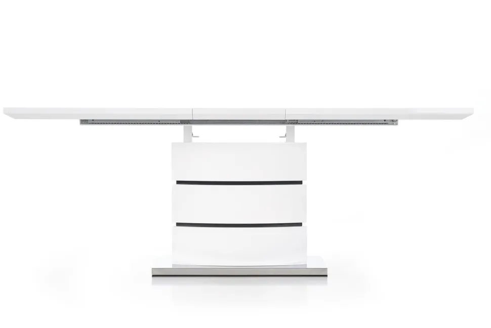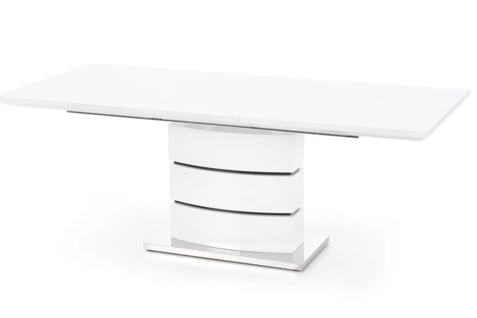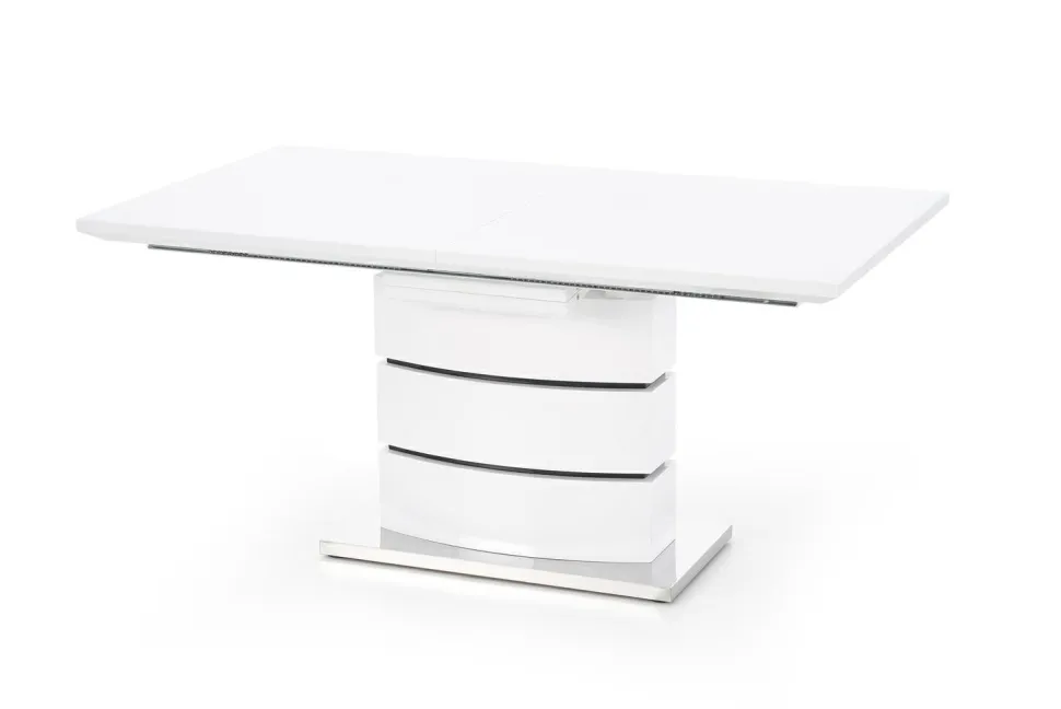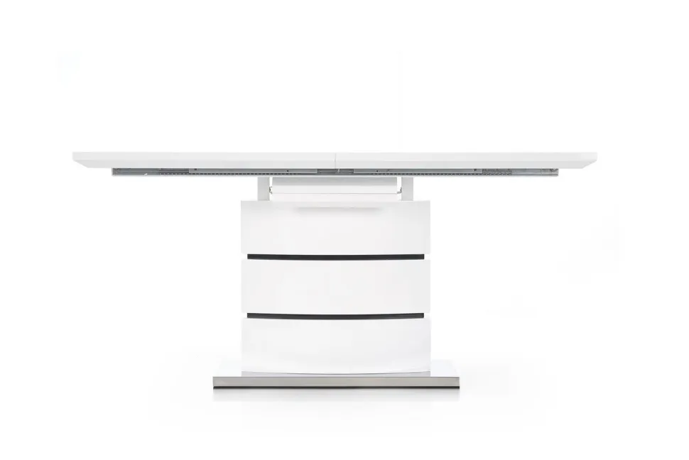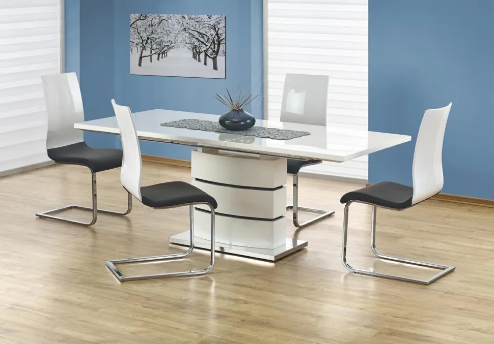Stół został wykonany z najwyższej jakości materiałów – MDF lakierowanego i stali nierdzewnej, co zapewnia trwałość i łatwość w utrzymaniu czystości. Jego prostokątny blat w kolorze białym z czarnymi pasami, w połączeniu z eleganckim stylem wykonania, nadaje pomieszczeniu nowoczesnego i glamour charakteru.Dzięki swoim wymiarom, stół pomieści zarówno 8, jak i 6 osób, co sprawia, że jest idealnym rozwiązaniem dla rodzin z większą liczbą członków lub dla osób lubiących organizować spotkania z przyjaciółmi.