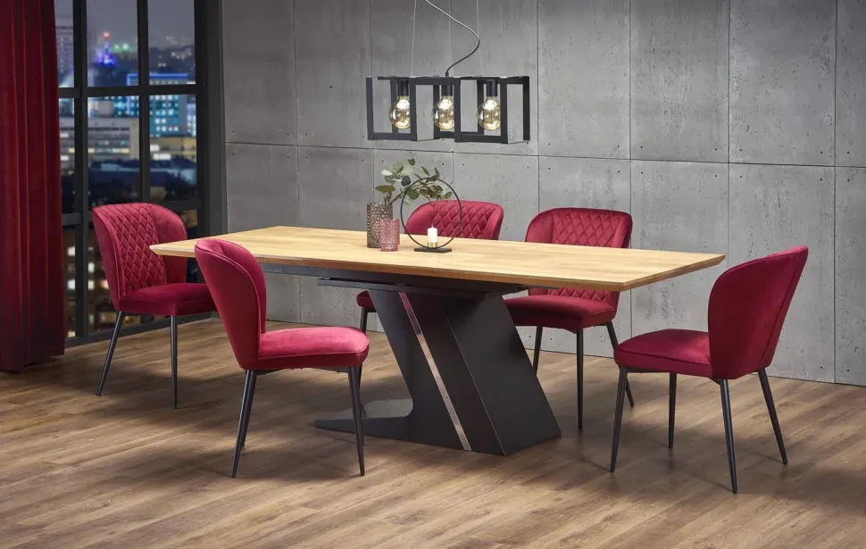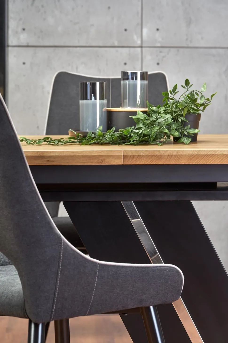 Blat stołu wykonany jest z MDF-u okleinowanego, co zapewnia trwałość i łatwość w utrzymaniu czystości. Kolor dębu naturalnego nadaje meblowi elegancki i ponadczasowy wygląd, który będzie pasował do każdego wystroju wnętrza. Stalowe nogi, malowane proszkowo na czarno, zapewniają stabilność i wytrzymałość stołu, co sprawia, że będzie on służył przez wiele lat. Stołowanie się przy nim jest wygodne, a nikt nie będzie musiał walczyć z niewygodnymi nogami.