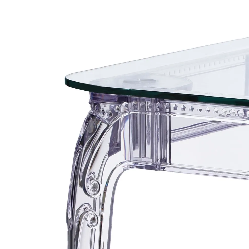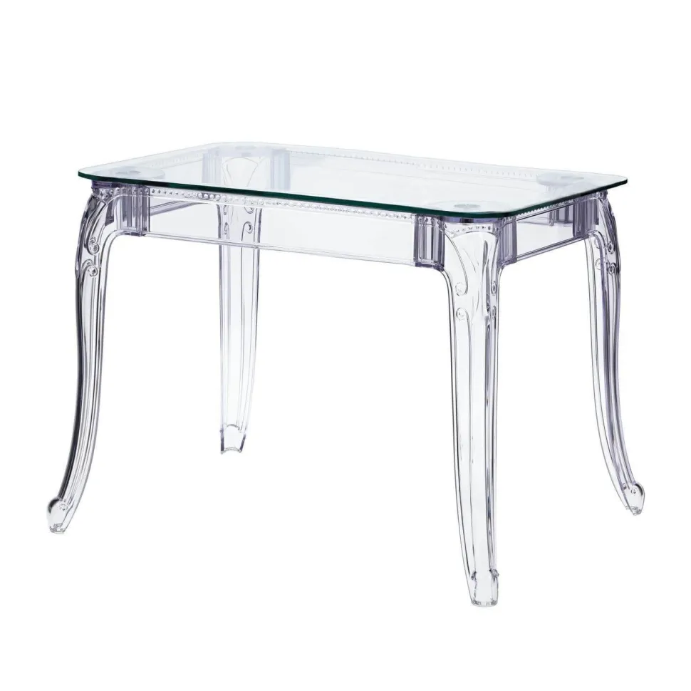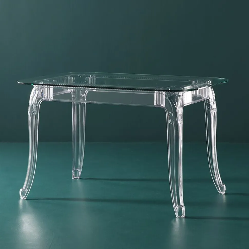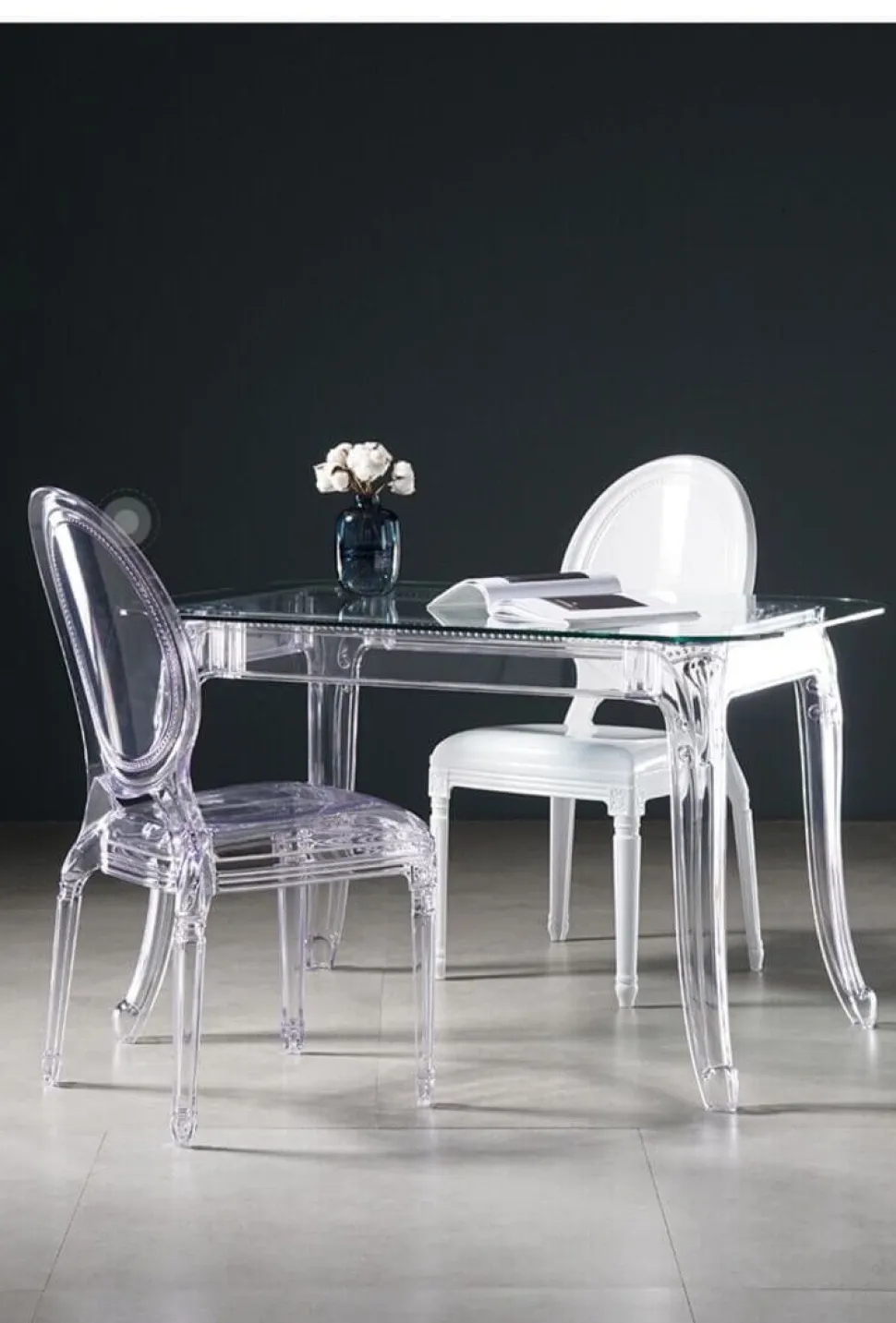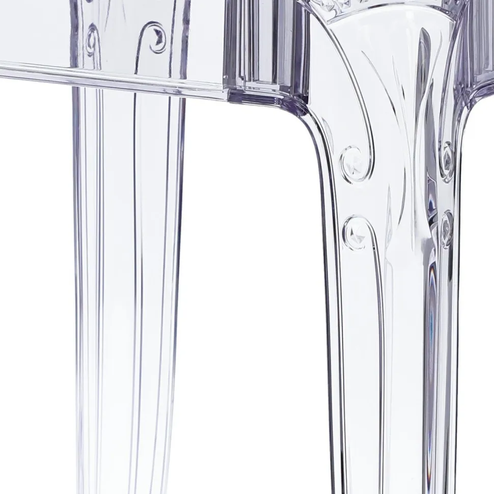 StółGhostto połączenie klasycznej wręcz barokowej formy oraz nowoczesnej techniki i wytrzymałych materiałów. StółGhostposiada szklany blat o grubości 10 mm, który podpierają bogato zdobione poliwęglanowe nogi. Poliwęglan to bardzo wytrzymałe tworzywo o szerokim zastosowaniu. Dzięki temu, że nogi stołu zostały zrobione ze sztucznego tworzywa, są one odporne na wilgoć. Szklany blat stołu dodaje mu lekkości, a wykorzystanie szkła sprawia, iż blat odporny jest na ciepło. Na stole możemy śmiało stawiać gorące naczynia bezobawy, iż blat się odparzy.Ghostto doskonały stół do małej jadalni, kuchni lub salonu. Przezroczysta forma mebla sprawia, iż nie przytłacza on pomieszczenia, a wręcz odbija światło i wnętrze wydaje się większe. Stół dostępny jest w dwóch rozmiarach. Grubość blatu: 10 mm Grubość nóg: od 5 do 8,5 cm