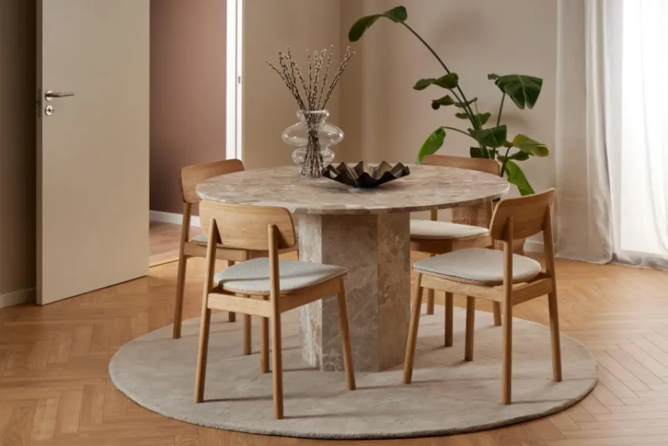 Stół Naxos 100 cm w kolorze brązowego marmuru to niezwykle elegancki i luksusowy element wyposażenia jadalni. Jego wyrafinowany design z geometrycznymi formami i naturalnymi materiałami doskonale wpisuje się w nowoczesne, jak i klasyczne wnętrza. Wykonany z lakierowanego marmuru w odcieniu latte brown, stół charakteryzuje się niepowtarzalnym wyglądem, dzięki różnicom w kolorze i strukturze kamienia, co sprawia, że każdy egzemplarz jest unikalny. Okrągły blat, osadzony na sześciokątnej podstawie, dodaje całości elegancji i solidności.