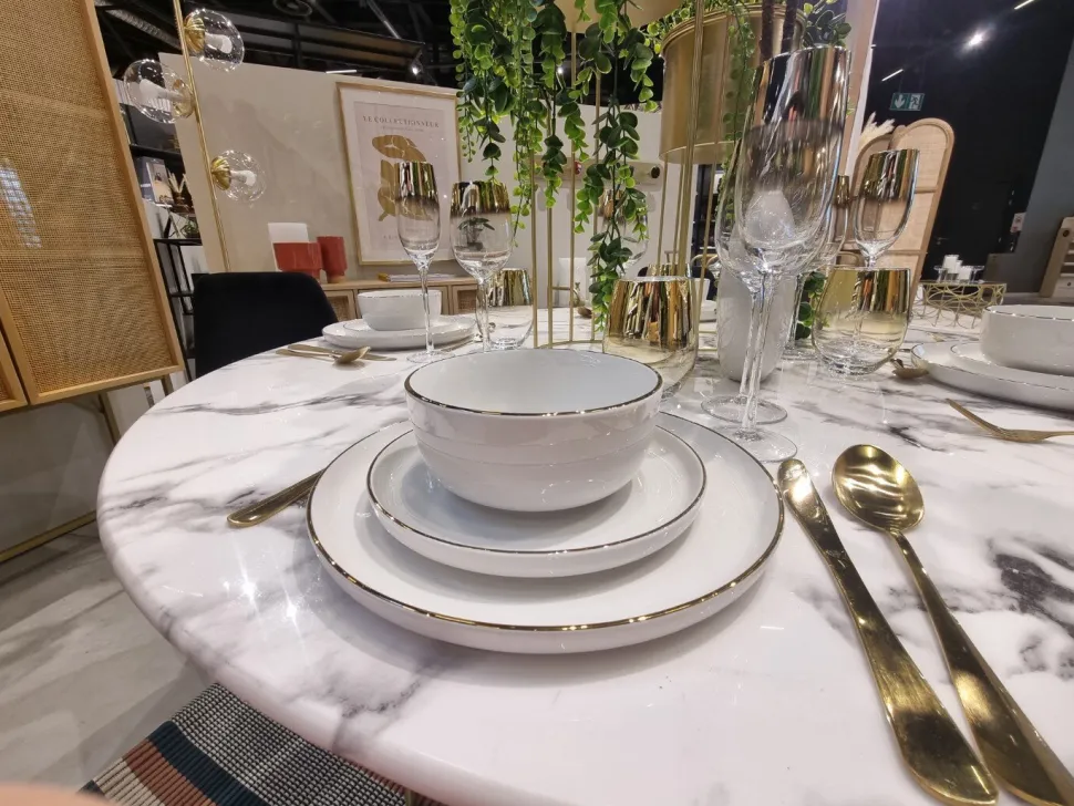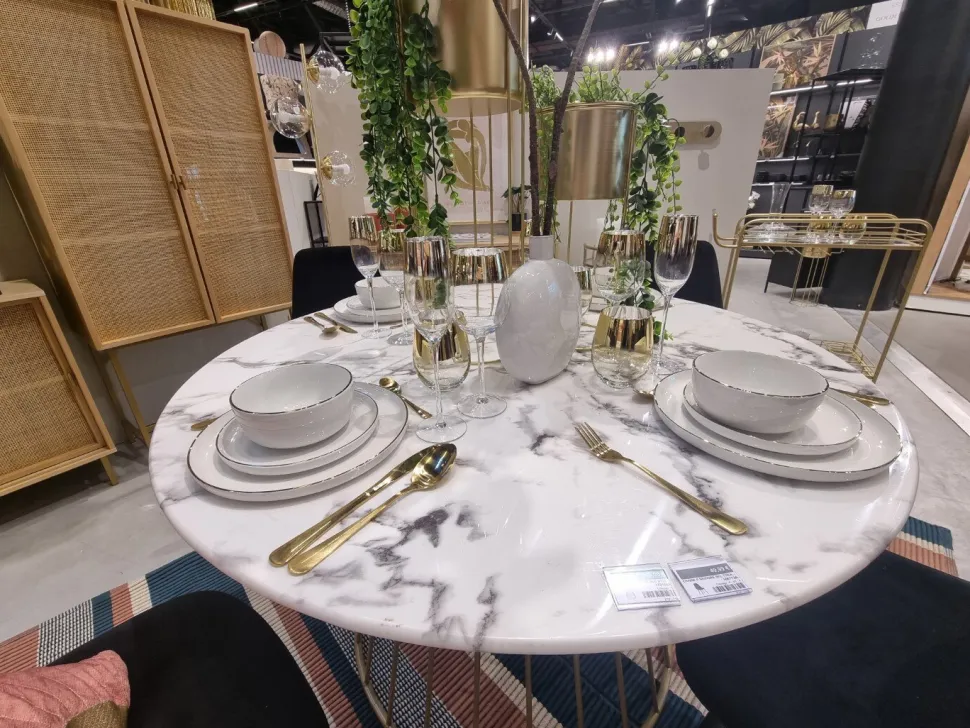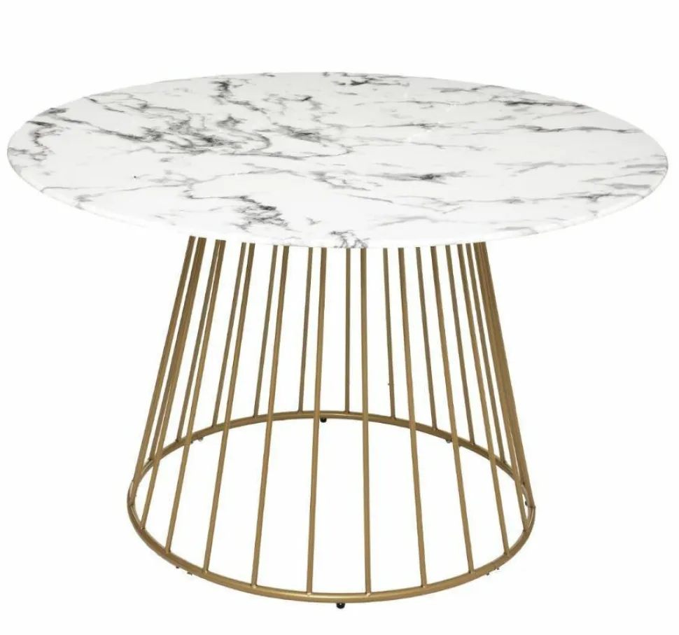 Dodaj blasku i wyrafinowania do swojego wystroju dzięki okrągłemu stołowi Rayo. Ten wykwintny mebel posiada ponadczasowy design, który łączy elegancki blat z marmurowego szkła hartowanego z oszałamiającą złotą metalową podstawą. Piękna kombinacja kolorów tworzy efekt glamour, idealny dla tych, którzy chcą nadać swojemu domowi designerskiego charakteru. Wykonany zgodnie z wzorcowymi standardami, ten wspaniały stół jest niezawodnym meblem, który może wytrzymać ciężar do 40 kg, co czyni go odpowiednim do użytku w salonach, kuchniach lub jadalniach. Wyposażony we wszystkie właściwe detale – takie jak klasyczne pionowe wsporniki i imponująca szerokość 120 cm – nie będziesz zawiedziony niezrównaną elegancją, jaką wnosi okrągły stół Rayo. Niech jego mieniąca się złotem podstawa zajmie centralne miejsce w Twoim pokoju i zamieni go w arcydzieło wnętrza.