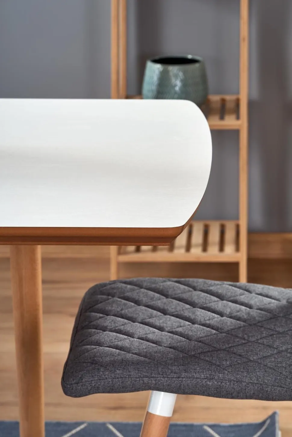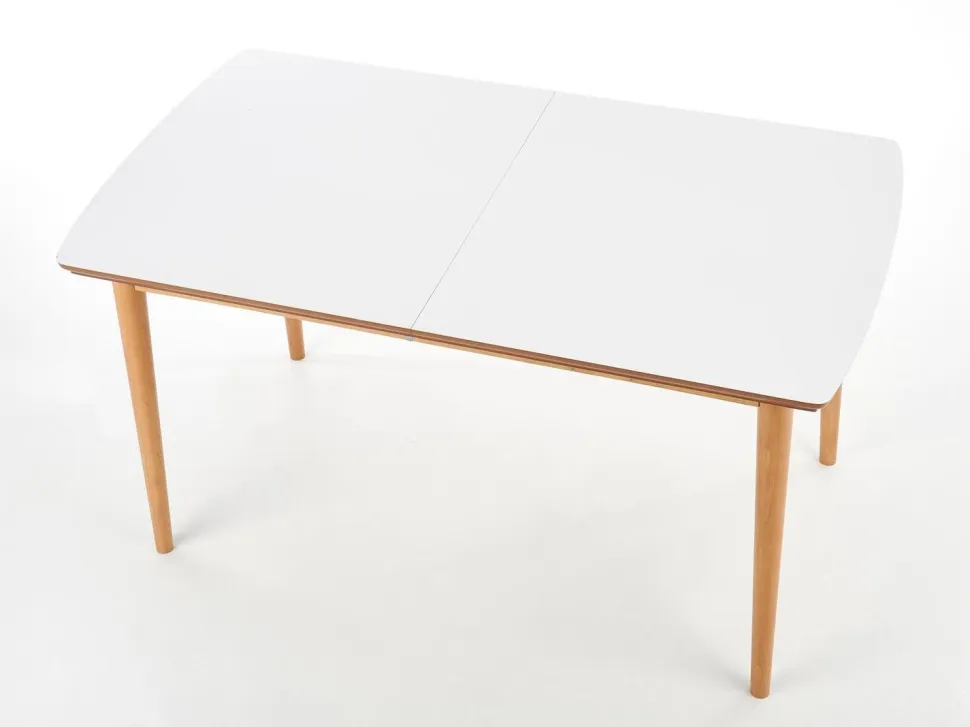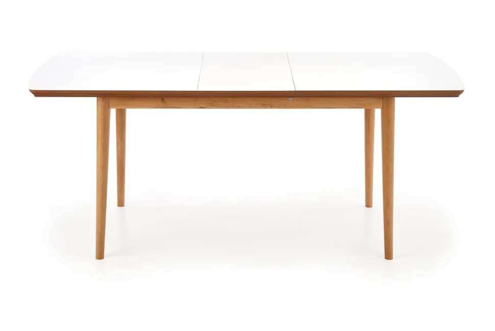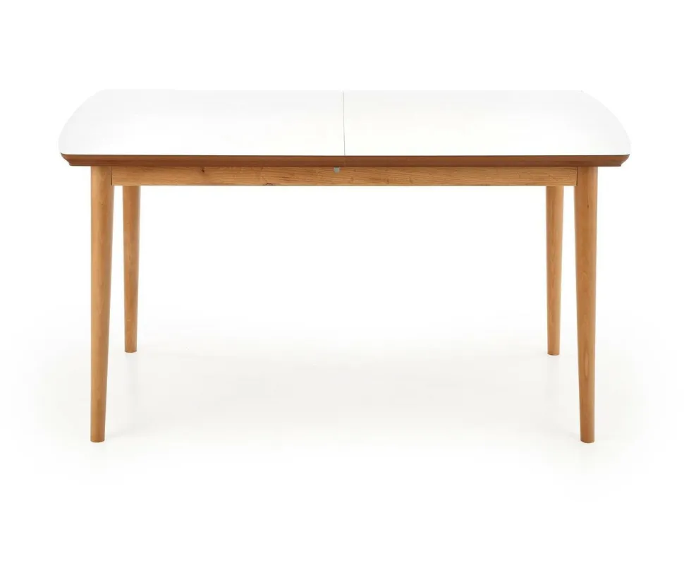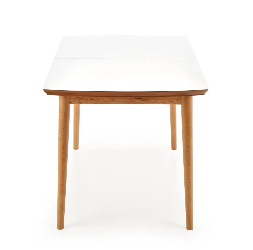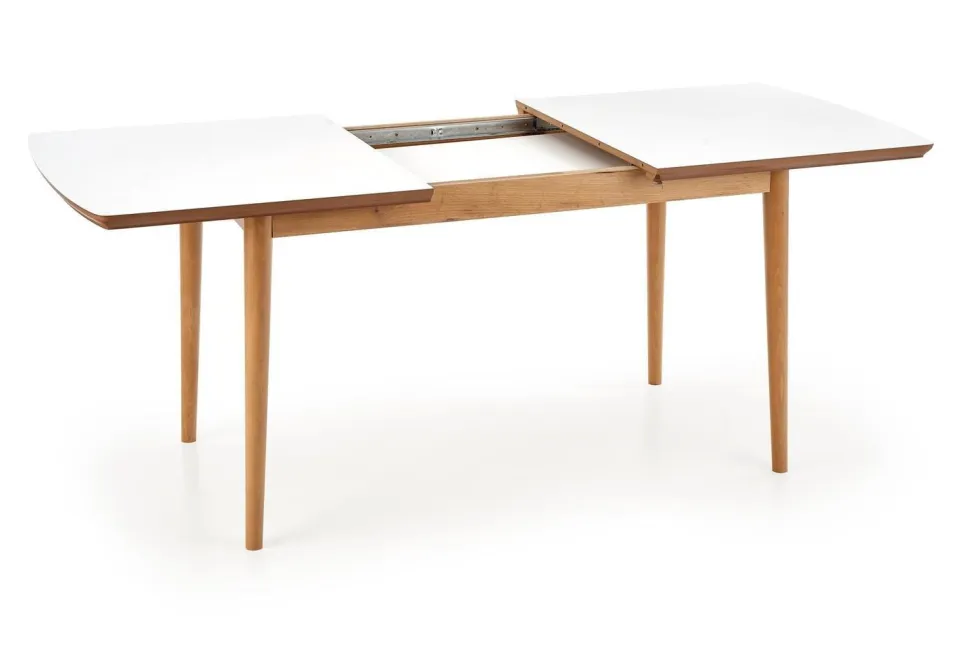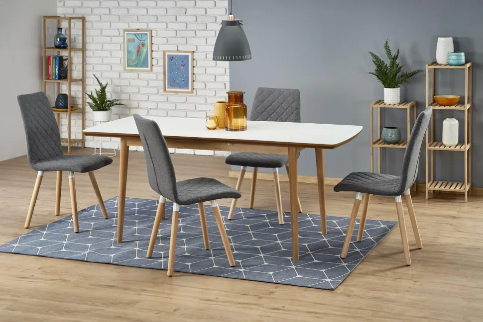 Prostokątny blat w kolorze białym mat doskonale kontrastuje z nogami w kolorze dębu lefkas, co nadaje mu skandynawskiego stylu, który z pewnością wprowadzi do Twojego wnętrza odrobinę nowoczesnego stylu.To jednak nie wszystko, co ten stół ma do zaoferowania! Dzięki możliwości rozłożenia stołu, zmieści się na nim nawet 8 osób, co sprawia, że jest idealny na rodzinne obiady oraz spotkania ze znajomymi.