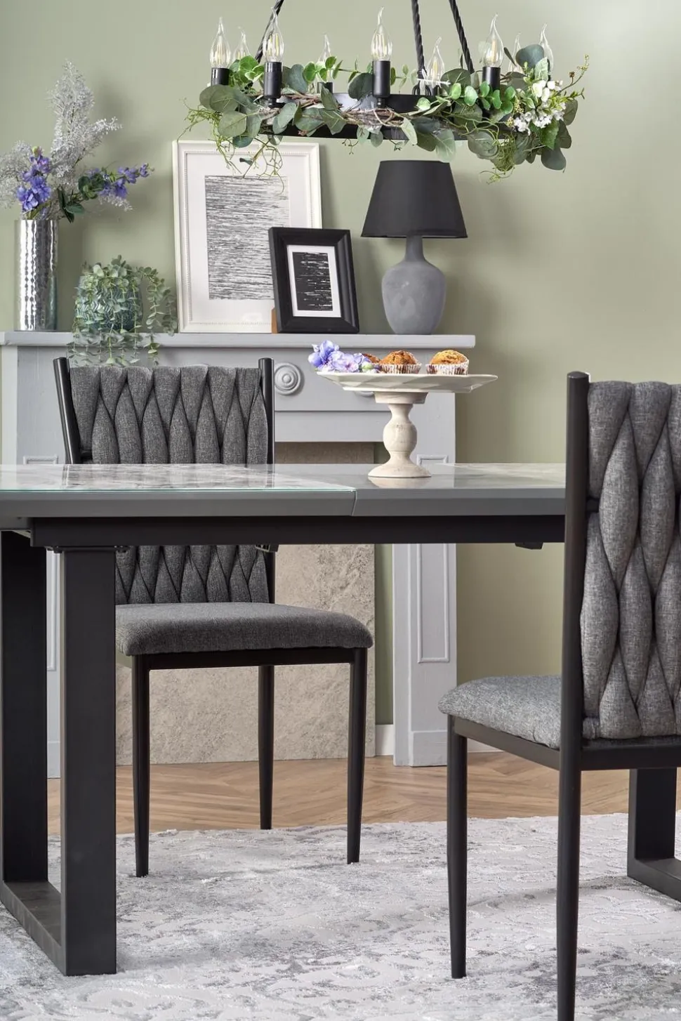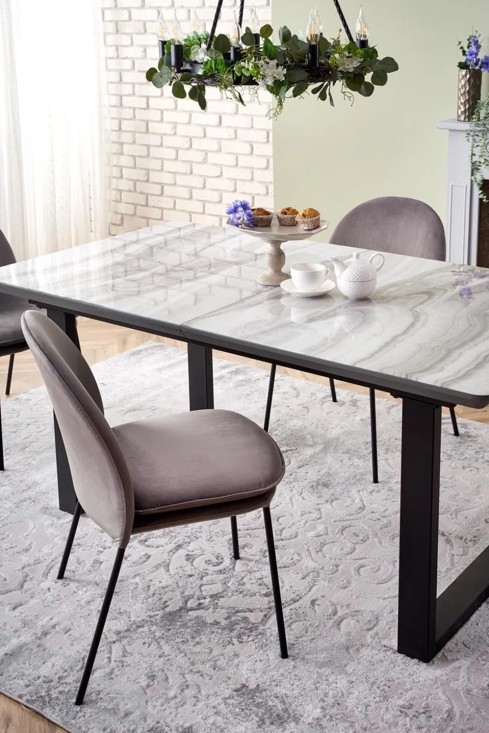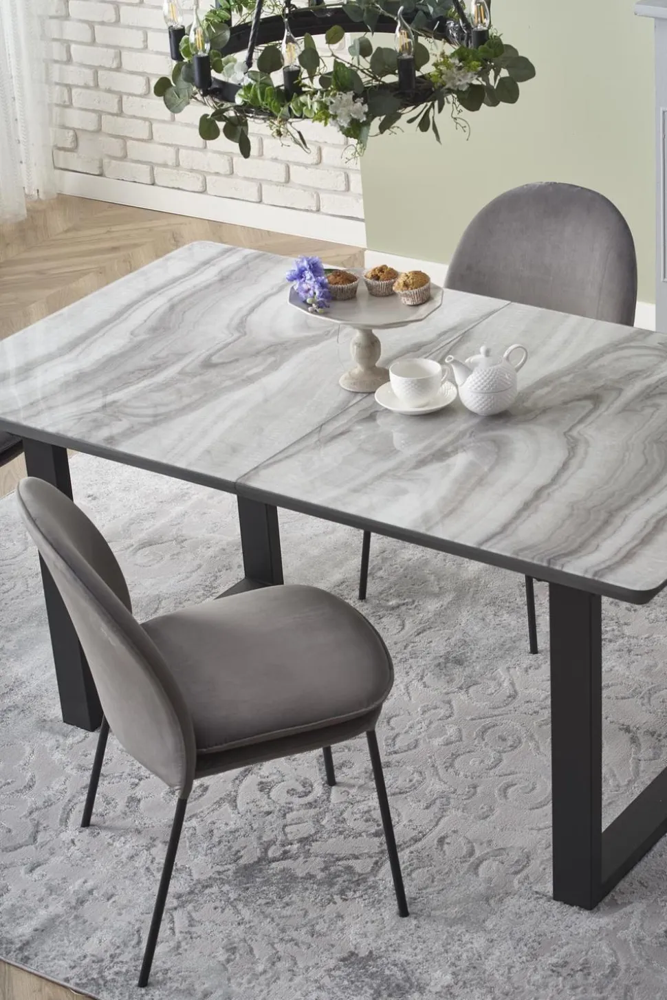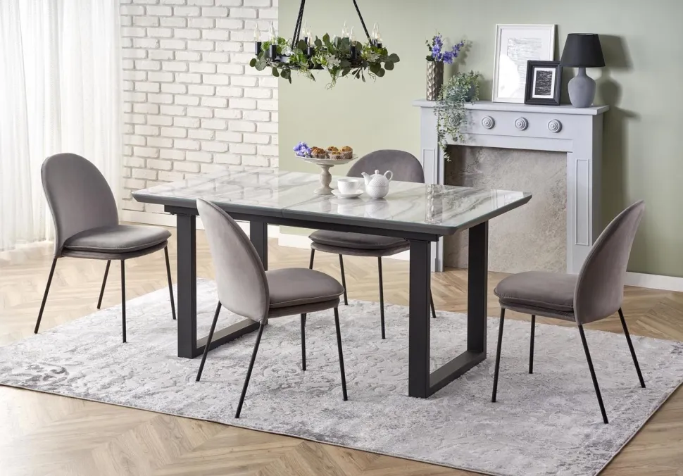 Materiały, z których został wykonany ten stół (szkło, MDF lakierowane, stal malowana proszkowo), zapewniają trwałość i estetyczny wygląd na długie lata. Blat w kolorze białego marmurui popielatym, w połączeniu z czarnymi nogami, nadaje stołowi loftowego i nowoczesnego stylu.Stół Rowel jest idealnym rozwiązaniem dla rodzin i osób, które często organizują spotkania ze znajomymi. Jego prostokątny kształt i wielkość sprawiają, że pomieści on wygodnie większą liczbę osób.