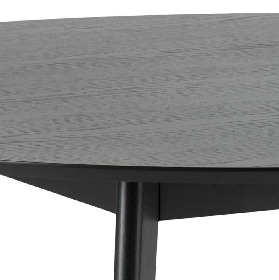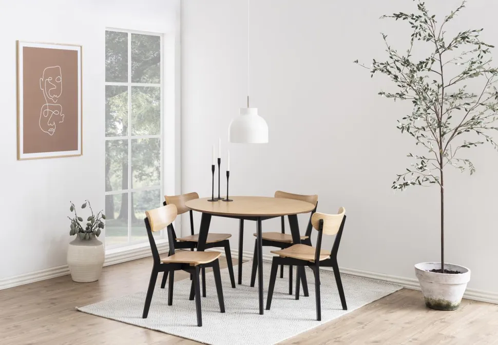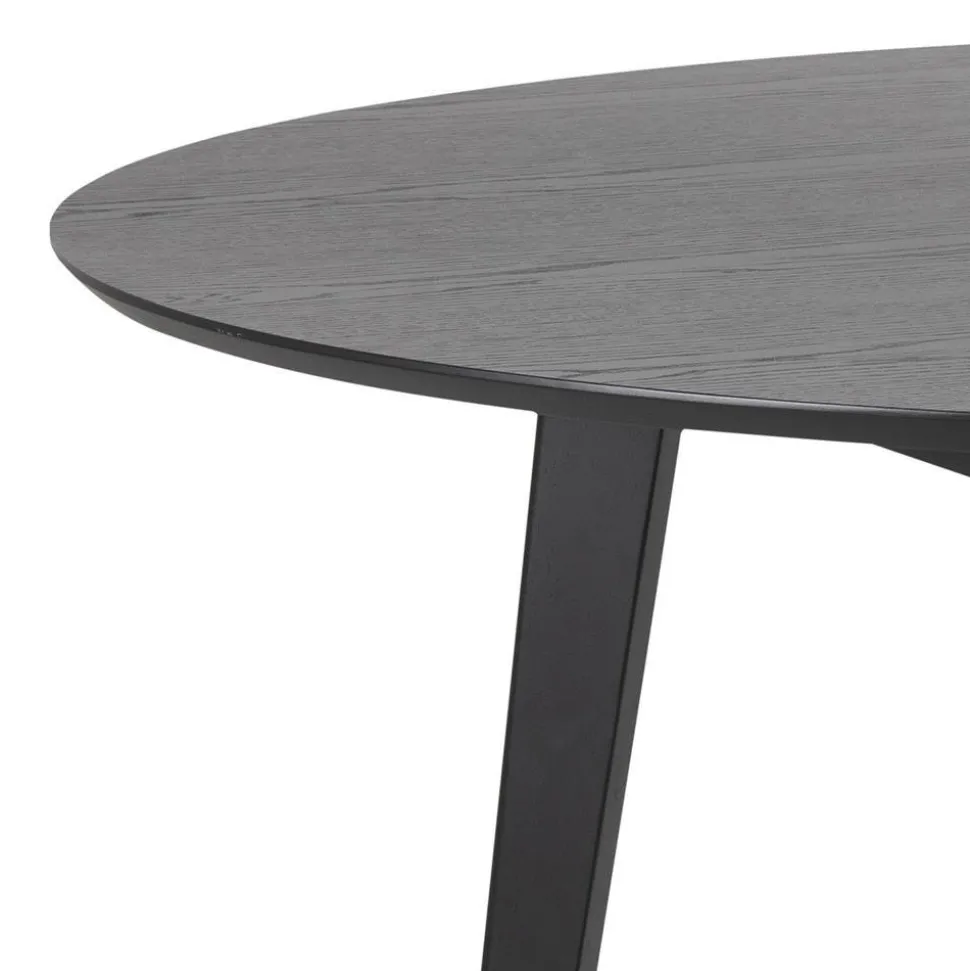 Okrągły stół Roxby utrzymany został w duchu minimalizmu. Geometria, prosta forma oraz jednolita kolorystyka to elementy, które sprawiają, że stół jest ponadczasowy. Blat fornirowany drewnem dębowym w czarnej kolorystyce o wykończeniu półmatowym dopełniony został podstawą wykonaną z drewna kauczukowego malowanego na kolor czarny. Stół Roxby wystepuje również z mniejszym blatem o średnicy 105 cm. Stół wymaga montażu, jego waga wynosi 31kg.