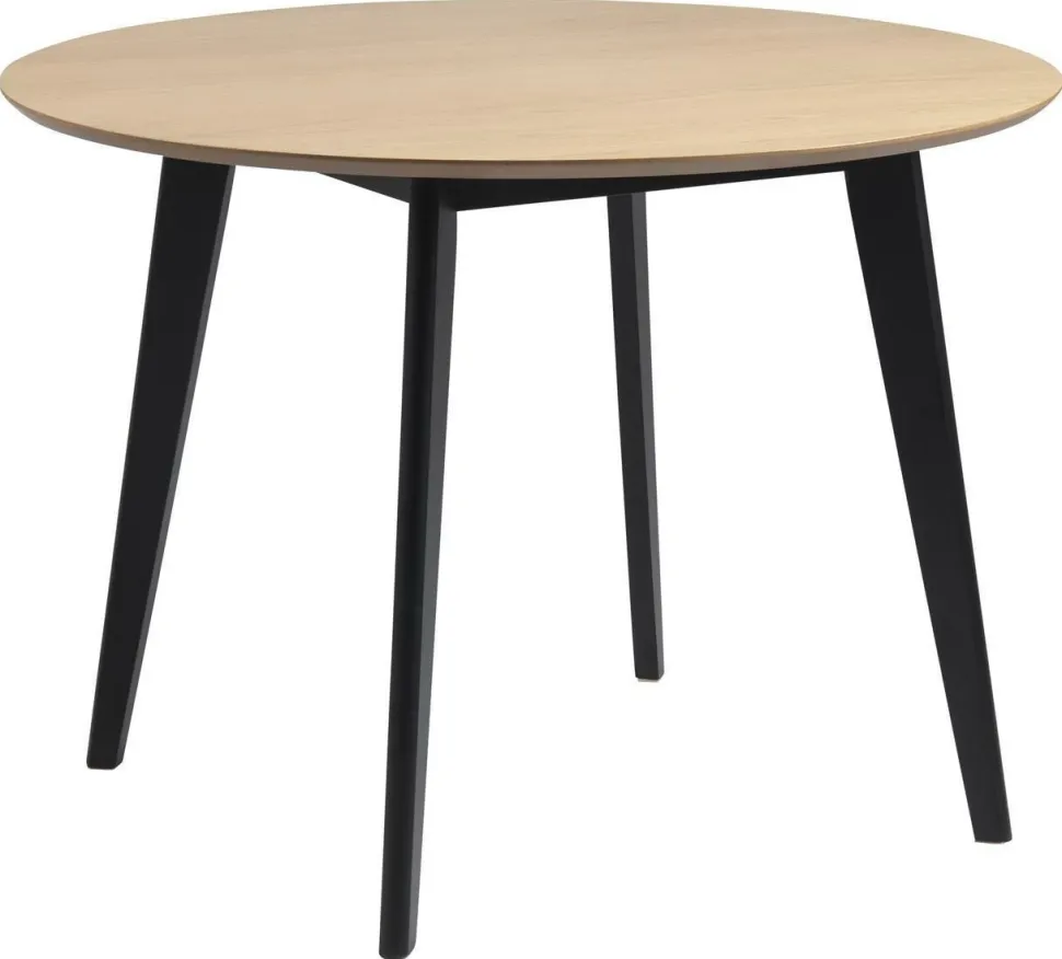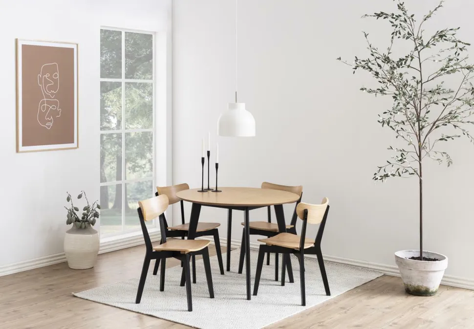 Poznaj przykład minimalistycznego, nowoczesnego wzornictwa o prostej i funkcjonalnej formie. Stół Roxby zokrągłym blatem to wysokiej jakości mebel, który posłuży na lata. Blat wykonany został z płyty drewnopodobnej w okleinie dębowej, która została subtelnie wykończona na krawędziach. Taki zabieg sprawił, że stół wydaje się być lekki mimo swoich gabarytów. Całość podtrzymują cztery nogi z drewna kauczukowego pomalowane na elegancki odcień czerni. Naturalny kolor drewna w połączeniu z ciemną podstawą sprawia, że Roxby będzie idealnym stołem do wnętrz modernistycznych, industrialnych jadalni i nowoczesnych salonów. Stół drewniany dla czterech osób Roxby będzie świetnie wyglądać z krzesłami o tej samej nazwie. Dzięki dostępnej kolekcji Roxby możesz stworzyć jednolite wnętrze z charakterem.