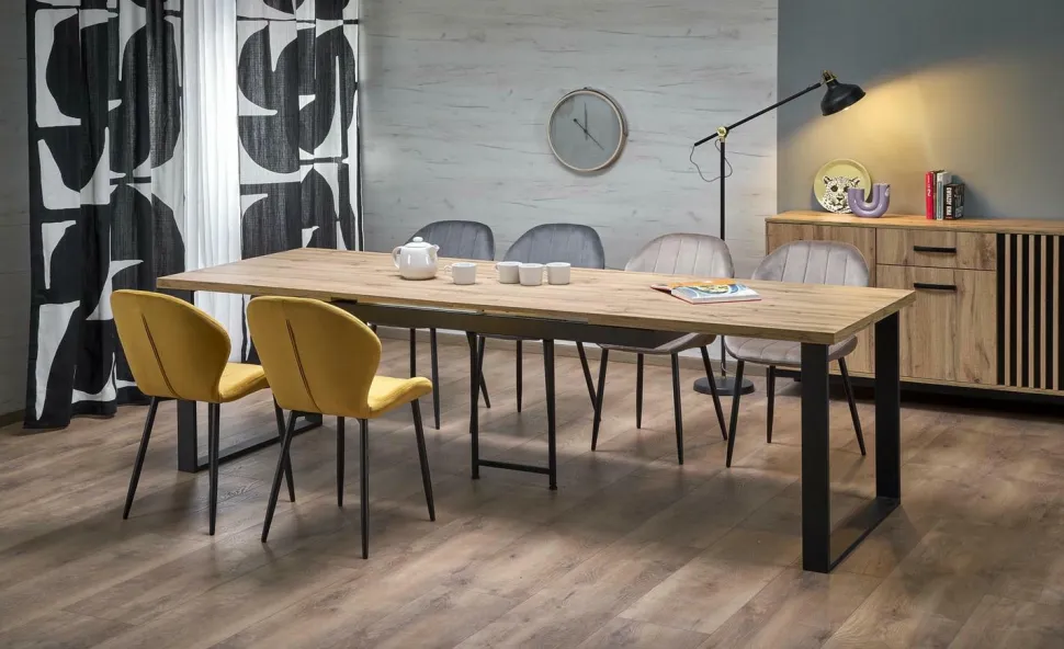 Stół rozkładany Vernon w kolorze dębu wotan z czarnymi metalowymi nogami to idealny wybór dla osób ceniących sobie funkcjonalność i styl. Jego największym atutem jest możliwość rozłożenia blatu z 160 cm do aż 310 cm, co pozwala na elastyczne dopasowanie do różnych potrzeb – od codziennych posiłków po większe spotkania rodzinne i towarzyskie. Dzięki temu stół Vernon sprawdzi się zarówno w mniejszych, jak i większych wnętrzach, gwarantując wygodę nawet dla dużej liczby gości.