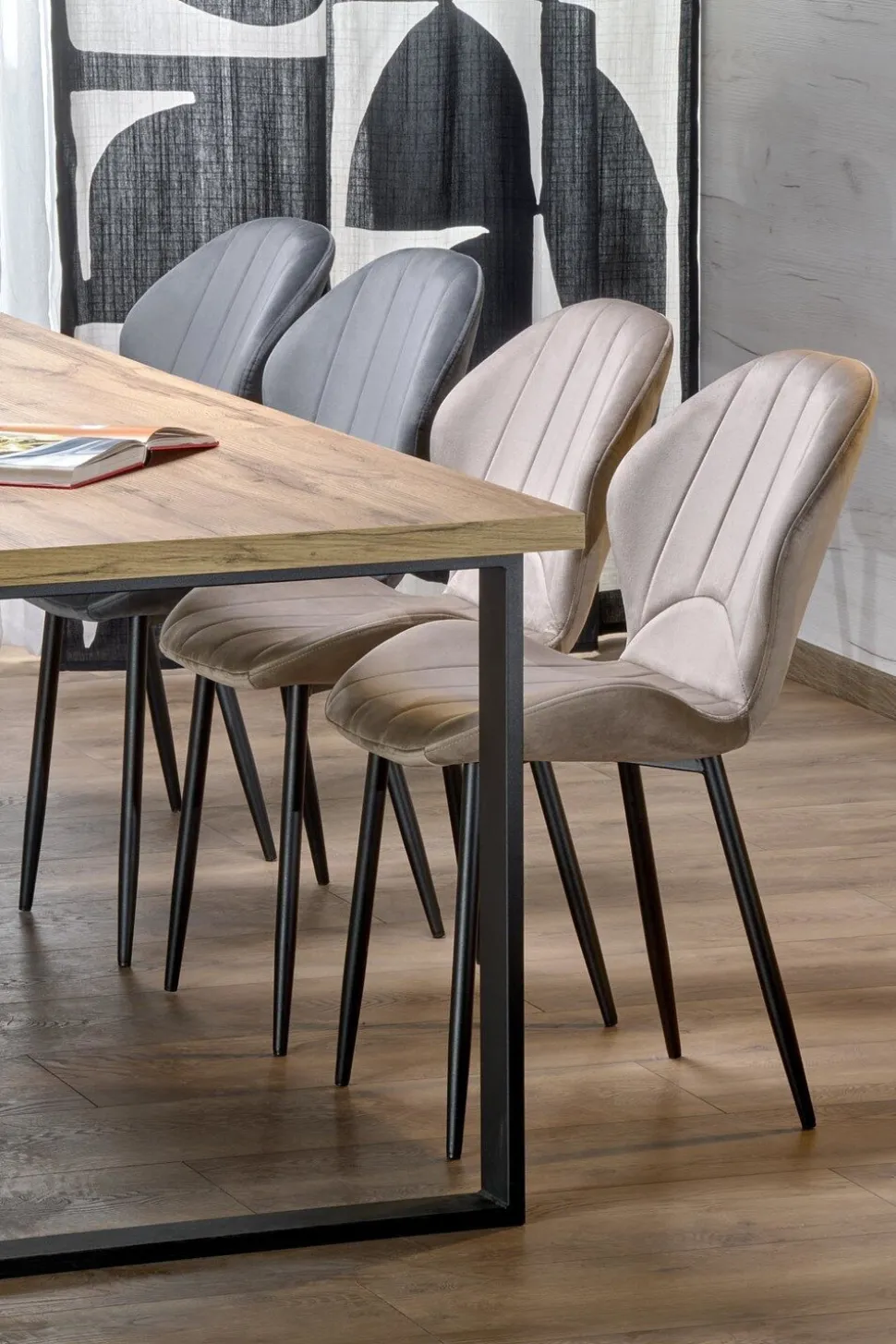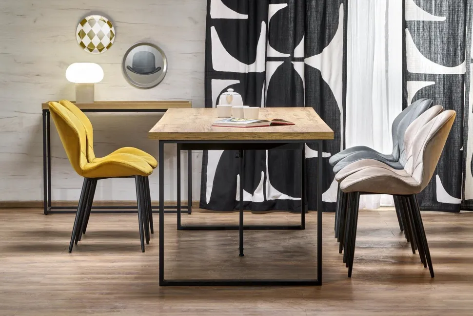 Blat stołu wykonany jest z wysokiej jakości płyty meblowej laminowanej w eleganckim wykończeniu w kolorze dębu wotan, co nadaje mu naturalny i ciepły wygląd. Stół jest także łatwy w pielęgnacji, co czyni go praktycznym wyborem do codziennego użytku. Jego czarne metalowe nogi, malowane proszkowo, dodają całości nowoczesnego i minimalistycznego charakteru, który świetnie wpasowuje się w nowoczesne wnętrza oraz te utrzymane w stylu industrialnym.