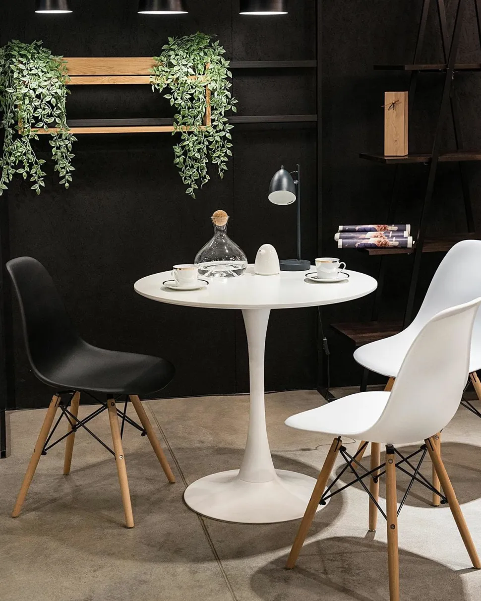 Biały stół z okrągłym blatem to idealny wybór do nowoczesnych wnętrz, które stawiają na nowoczesne formy pozbawione ozdobników. Minimalistyczny stolik będzie świetnie wyglądał w towarzystwie futurystycznych krzeseł z tworzywa i eleganckiej lampy wiszącej.