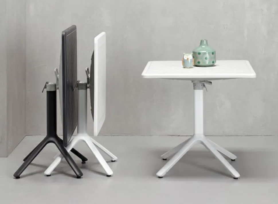 Stół Eco to doskonałe rozwiązanie, solidność i elegancja, które sprawiają, że sprawdza się zarówno wewnętrznie, jak i na zewnątrz. Filozofia podstawowego projektu Eco jest bardziej widoczna w wersji oszczędzającej miejsce z blatem, który składa się, aby zmieścić się obok innych stołów.