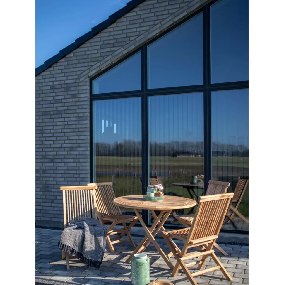 Stół wykonany jest w całości z drewna tekowego. Okrągły blat składa się z krótkich desek ułożonych w prosty wzór. Na każdej z nich widać fakturę drewna, co nadaje meblowi niepowtarzalnego charakteru.