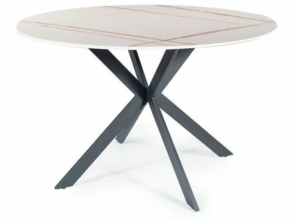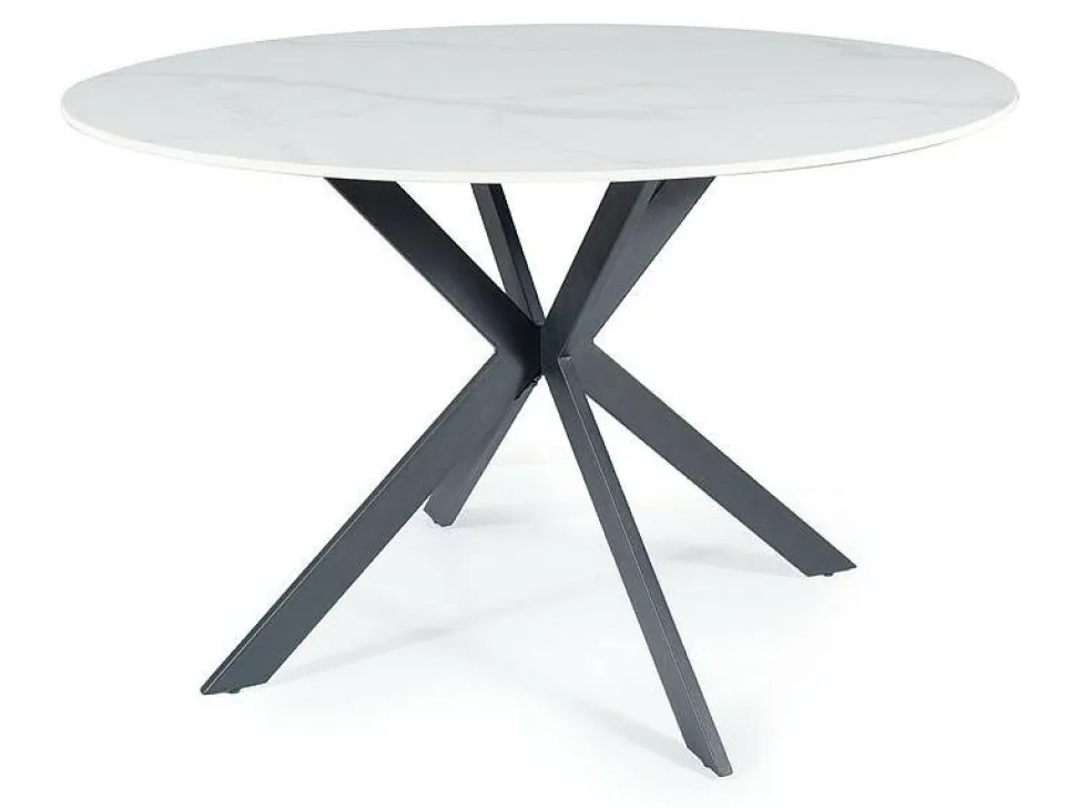Stół Talizman 120cm biały marmur/czarny Stół Talizman o średnicy 120 cm to wyjątkowy mebel, który łączy w sobie funkcjonalność i designerski styl glamour. Jegoczarny, metalowy stelaż z podstawą w kształcie Xnadaje stołowi solidności, tworząc zarazem harmonijny kontrast zokrągłym blatem,wykonanym z ceramiki imitującej efekt białego marmuru. Idealny do przestrzeni jadalnianych lub salonu, to nie tylko miejsce, gdzie spożywasz posiłki, ale także designerski akcent, który przyciąga wzrok i nadaje wnętrzu nowoczesnego charakteru. Mebel jestniezwykle solidny,co sprawia, że stanowi stabilną i trwałą bazę dla różnorodnych spotkań przy stole. Ceramika i metalowe nogi sprawiają, że stół nie tylko prezentuje się stylowo, ale także jestniezwykle trwały i wytrzymały.To mebel, który posłuży Ci na lata, zachowując swój designerski urok. Przygotuj się na mądry wybór! Czarny stelaż w formie podstawy X w kontraście z okrągłym blatem. Idealny do przestrzeni jadalnianych lub salonu, gwarantuje stabilność i trwałość. Wykonanie z ceramiki i metalu sprawia, że stół jest nie tylko designerski, ale również trwały i wytrzymały na lata.
