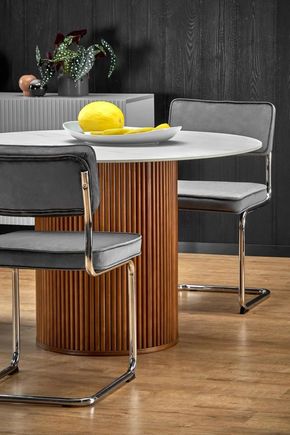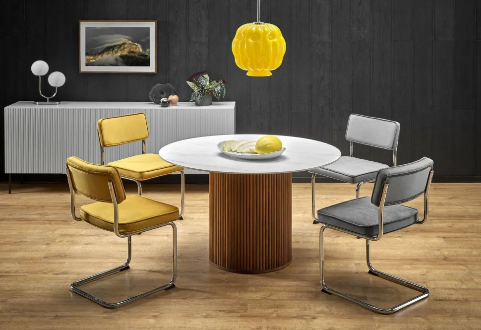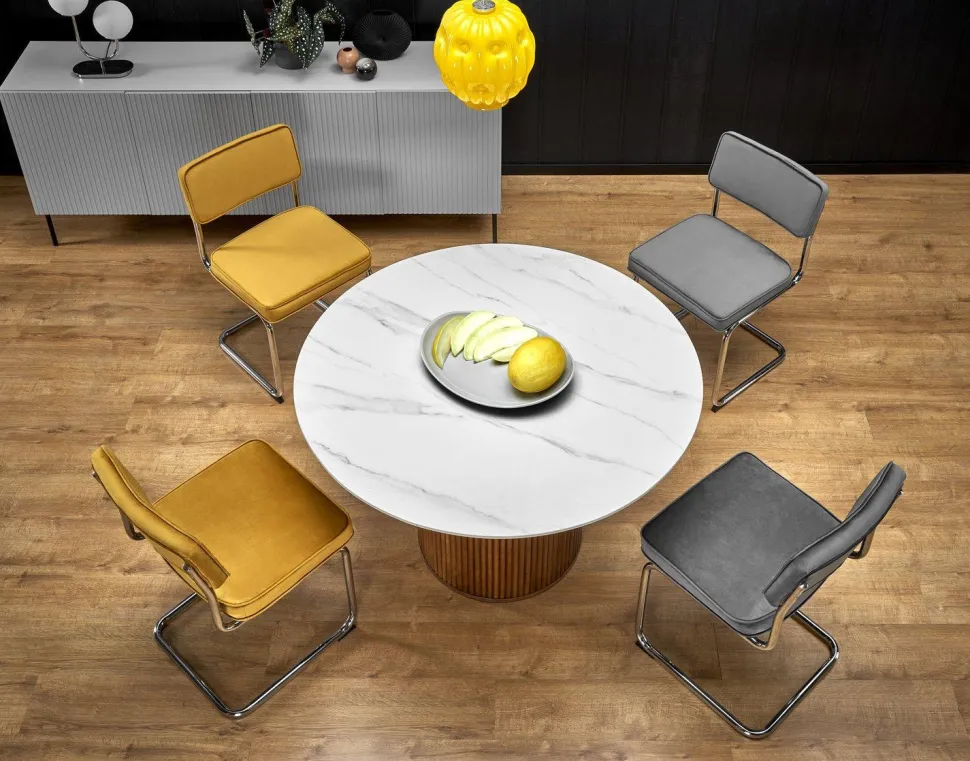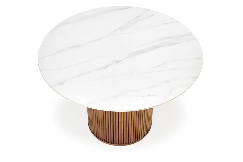 Ten piękny, okrągły stół to idealny wybór dla rodzin lub grup przyjaciół, którzy cenią sobie elegancki wygląd i wygodę. Blat wykonany z wysokiej jakości ceramiki w kolorze białego marmuru jest nie tylko trwały i łatwy w utrzymaniu, ale także dodaje stylowego wykończenia do każdego wnętrza. Drewniane nogi w kolorze orzechowym dodają ciepła i naturalnego uroku, a jedna solidna noga zapewnia stabilność i wytrzymałość.