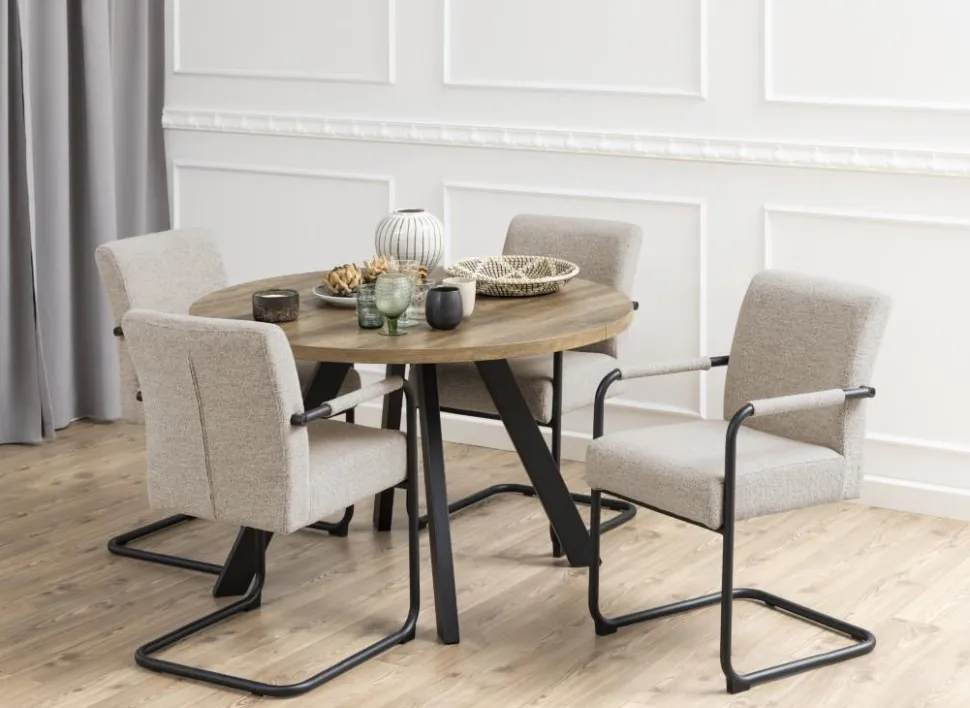 Stół Zalida to praktyczne rozwiązanie do salonu, kuchni lub jadalni. Posiada podstawę składającą się z czterech metalowych nóg malowanych proszkowo oraz okrągły blat pokryty okleiną imitującą słoje dębu. Blat stołu Zarina można powiększyć, aby zmieściła się przy nim cała rodzina. Jego wysokość 75 cm jest idealnym rozwiązaniem dla niewygodnych przestrzeni lub niskich sufitów. Stół Zalida ma elegancki i ponadczasowy design w kolorze białym, czarnym i dębowym, który można łatwo połączyć z różnymi typami wnętrz. Wykorzystaj w pełni swoją przestrzeń życiową z tym praktycznym rozwiązaniem od Actony!