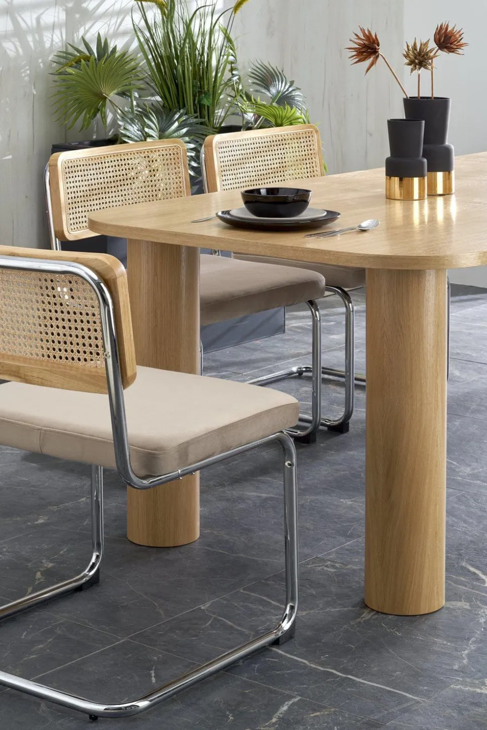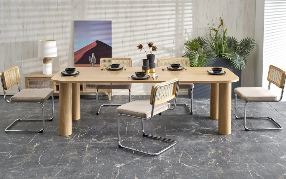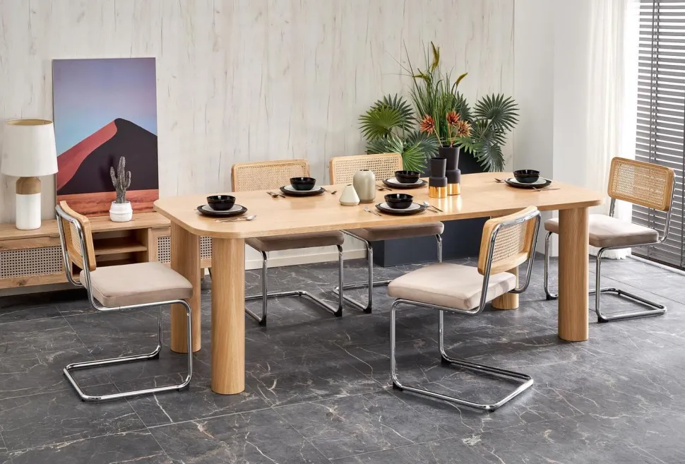 Stół wykonany jest z naturalnej okleiny dębowej, co nadaje mu elegancki i nowoczesny wygląd, a jednocześnie zapewnia trwałość i odporność na uszkodzenia. Prostokątny kształt stołu umożliwia łatwe ustawienie w pomieszczeniach o różnych rozmiarach i kształtach, co sprawia, że stół Zilonis jest idealnym wyborem dla każdego, kto ceni sobie funkcjonalność i estetykę. Stół Zilonis jest dostępny w dwóch rozmiarach – 8-osobowym i 10-osobowym – co pozwala na dopasowanie go do indywidualnych potrzeb i wymagań.