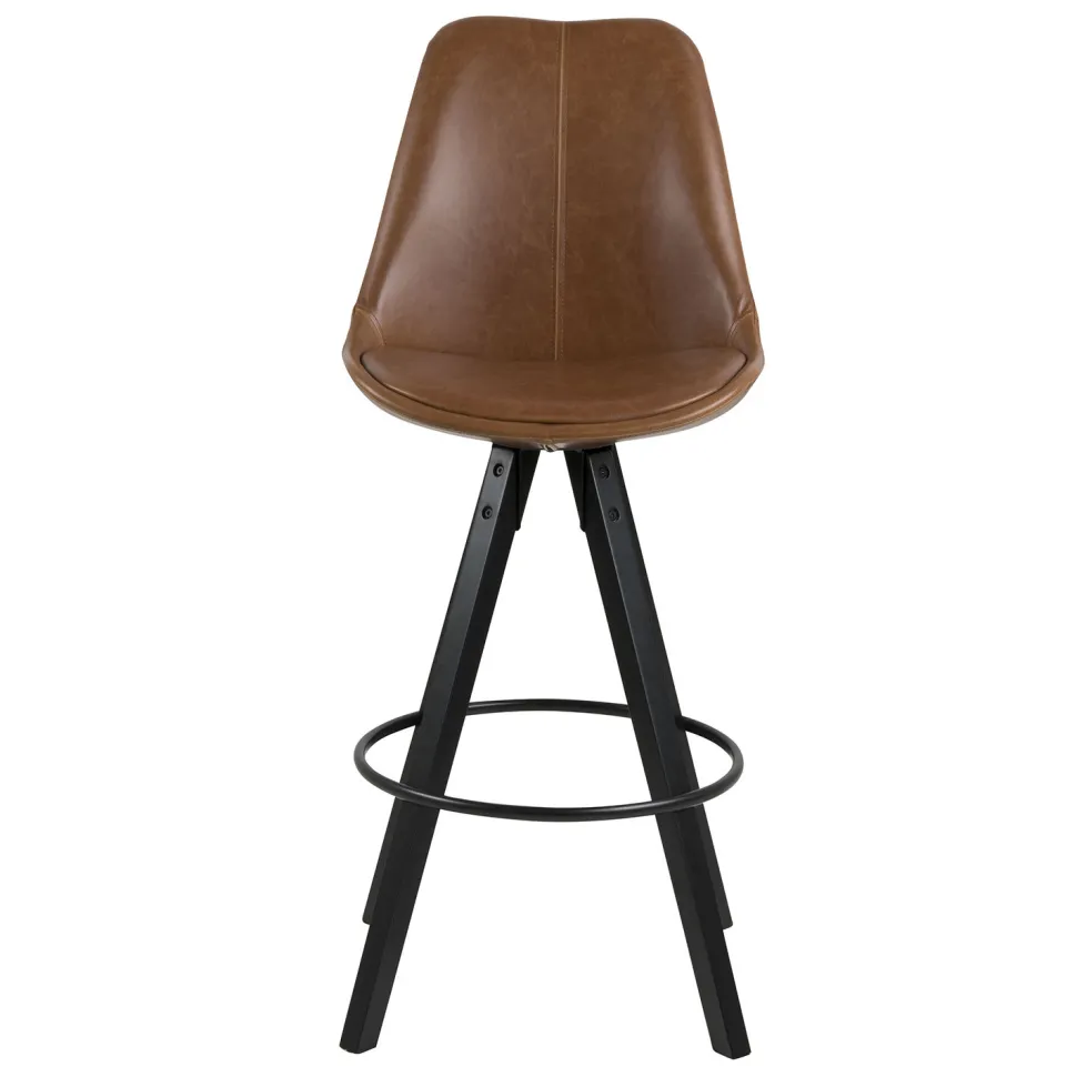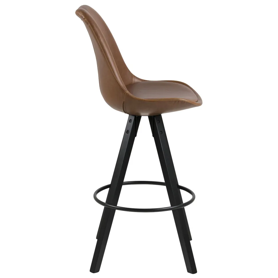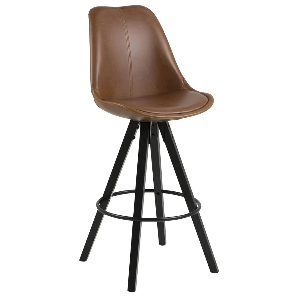 Stołek barowy Dima Brandy to mebel użytkowy, który sprawdzi się doskonale w przestrzeni publicznej, ale również domowej, przestrzennej kuchni. Siedzisko tapicerowane jest skórą ekologiczną w kolorze brązowym. Podstawa wykonana została z drewna kauczukowego barwionego na kolor czarny.