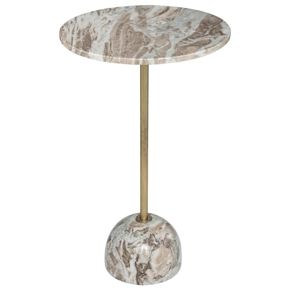 Stolik boczny Nema w beżowym marmurowym wykończeniu to stylowy i elegancki dodatek, który doskonale uzupełni wystrój każdego salonu. Ten mebel marki Atmosphera zachwyca swoim nowoczesnym, a jednocześnie wyrafinowanym designem. Jego dzwonowata podstawa oraz okrągły blat wykonane są z marmuru, co nadaje stolikowi wyjątkowy charakter i solidność. Całość wspiera błyszcząca metalowa konstrukcja, która dodaje blasku i nowoczesnego akcentu.