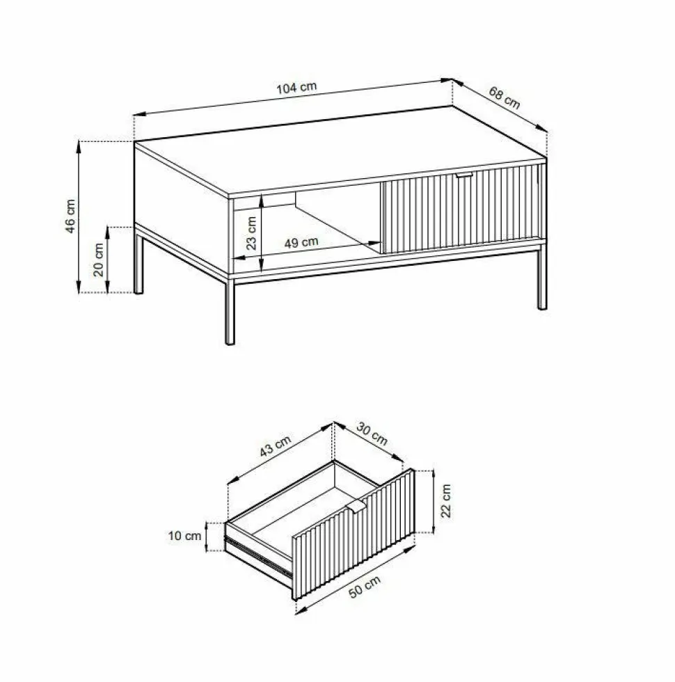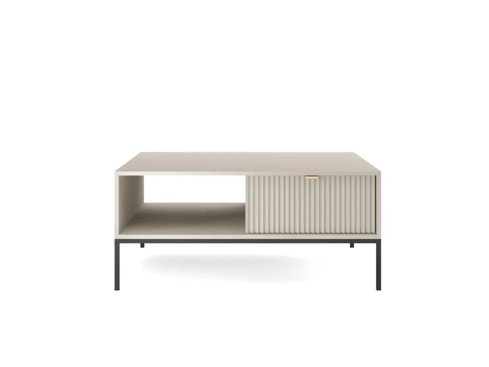 Stolik Delicious to połączenie nowoczesności z wyrafinowanym stylem. Jego kaszmirowy kolor oraz ryflowany front szuflady to kwintesencja elegancji. Aluminiowy uchwyt w kolorze złotym dodaje mu wyjątkowego uroku. Jest nie tylko ozdobą, ale także praktycznym meblem. Szerokość 104 cm i głębokość 68 cm zapewniają dużo miejsca na przechowywanie różnych przedmiotów, od podkładek pod kawę, po ładowarki do telefonów czy książki.