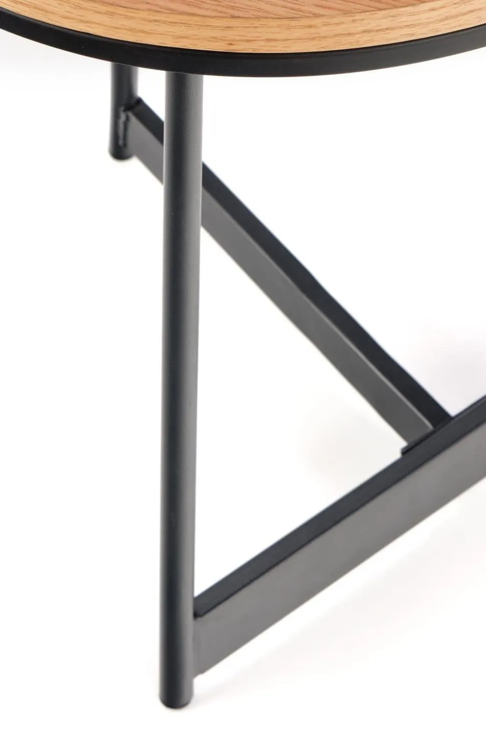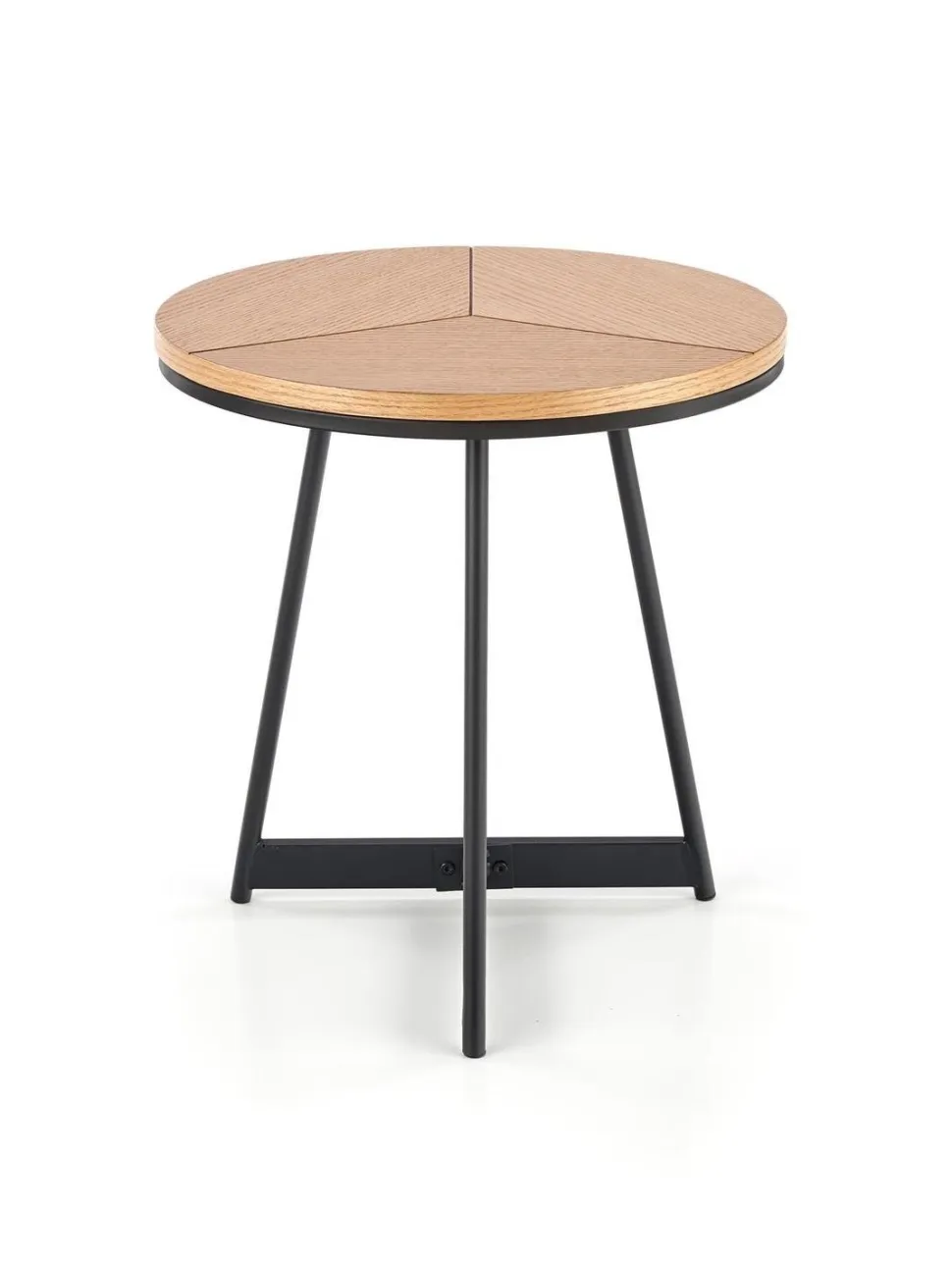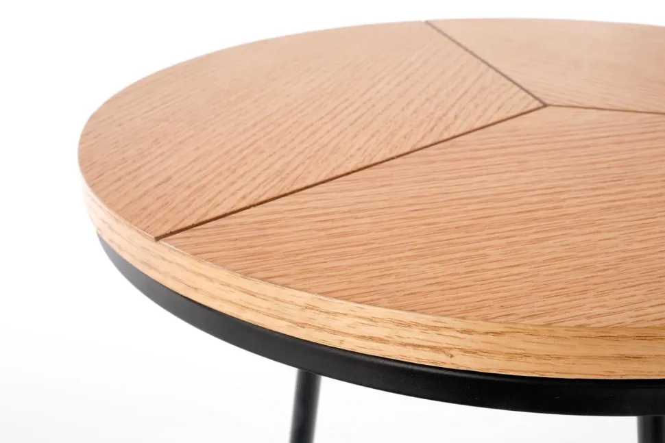 Stolik został wykonany z wysokiej jakości materiałów, co gwarantuje jego trwałość i solidność. Blat wykonany z MDF w okleinie naturalnej prezentuje się niezwykle efektownie, dodając wnętrzu ciepła i przytulności. Doskonale komponuje się on z malowanym proszkowo stelażem wykonanym z metalu w eleganckim, czarnym kolorze, co nadaje stolikowi nowoczesnego charakteru. Okrągły kształt blatu stolika dodaje mu lekkości i harmonii, a zarazem zapewnia praktyczne miejsce do przechowywania różnorodnych przedmiotów. Stabilny stelaż metalowy jest nie tylko wytrzymały, ale także stanowi stylowy kontrast wobec naturalnego drewna, podkreślając industrialny charakter wnętrza.