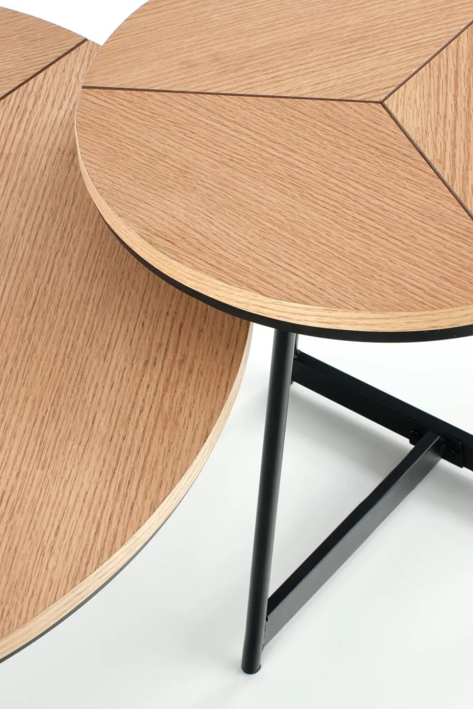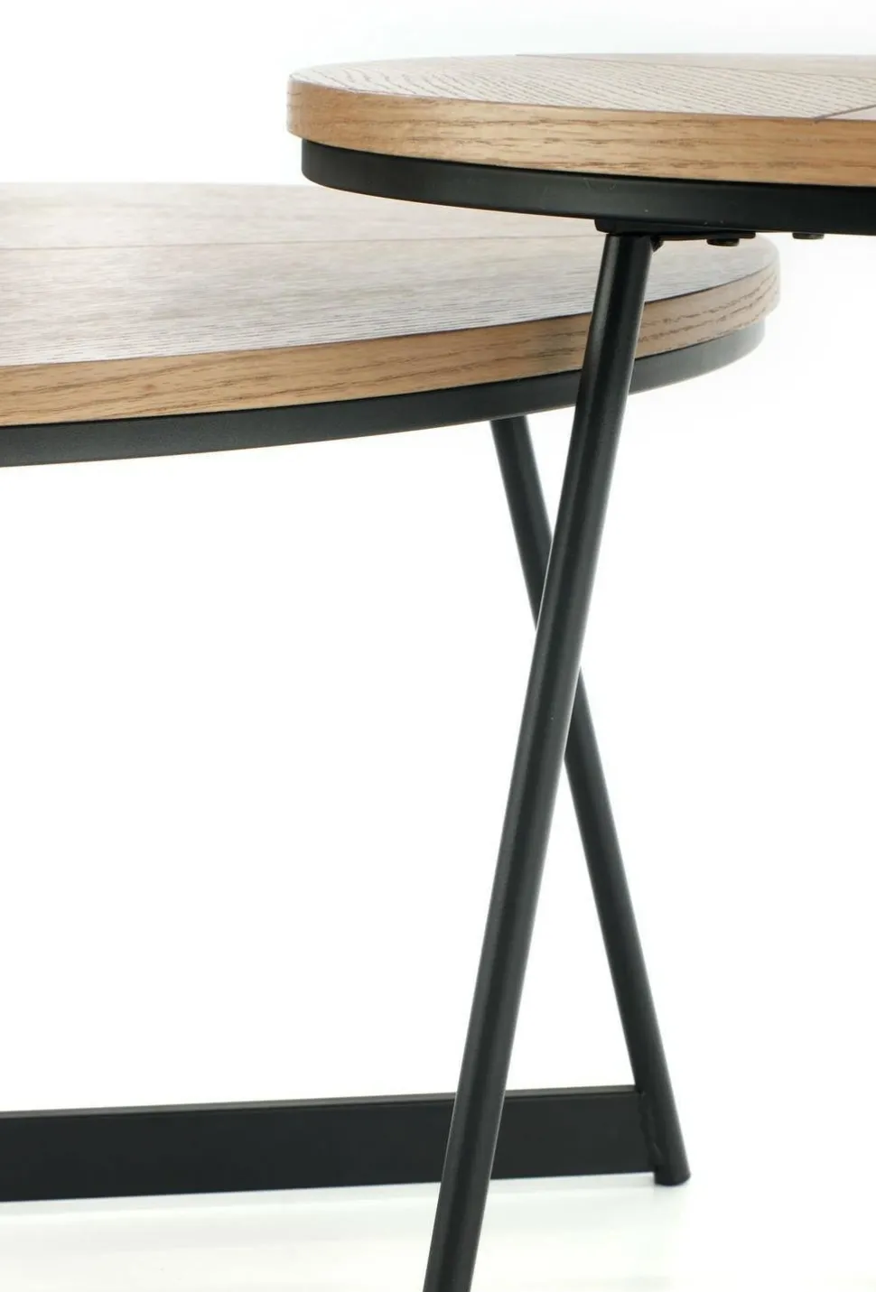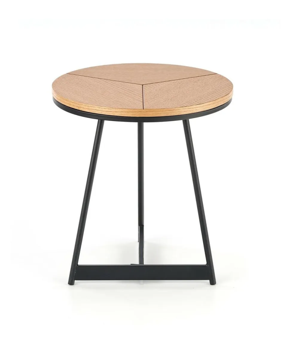 Stolik został wykonany z wysokiej jakości materiałów, co gwarantuje jego trwałość i solidność. Blat wykonany z MDF w okleinie naturalnej prezentuje się niezwykle efektownie, dodając wnętrzu ciepła i przytulności. Doskonale komponuje się on z malowanym proszkowo stelażem wykonanym z metalu w eleganckim, czarnym kolorze, co nadaje stolikowi nowoczesnego charakteru. Okrągły kształt blatu stolika dodaje mu lekkości i harmonii, a zarazem zapewnia praktyczne miejsce do przechowywania różnorodnych przedmiotów. Stabilny stelaż metalowy jest nie tylko wytrzymały, ale także stanowi stylowy kontrast wobec naturalnego drewna, podkreślając industrialny charakter wnętrza.