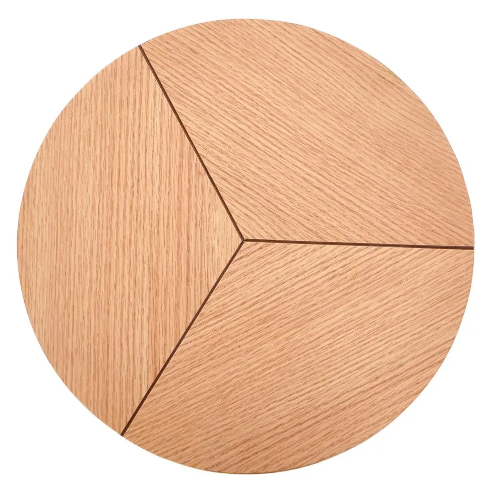 - Okrągły blat z okleiną naturalną w kolorze dębu naturalnego dodaje ciepła i elegancji.