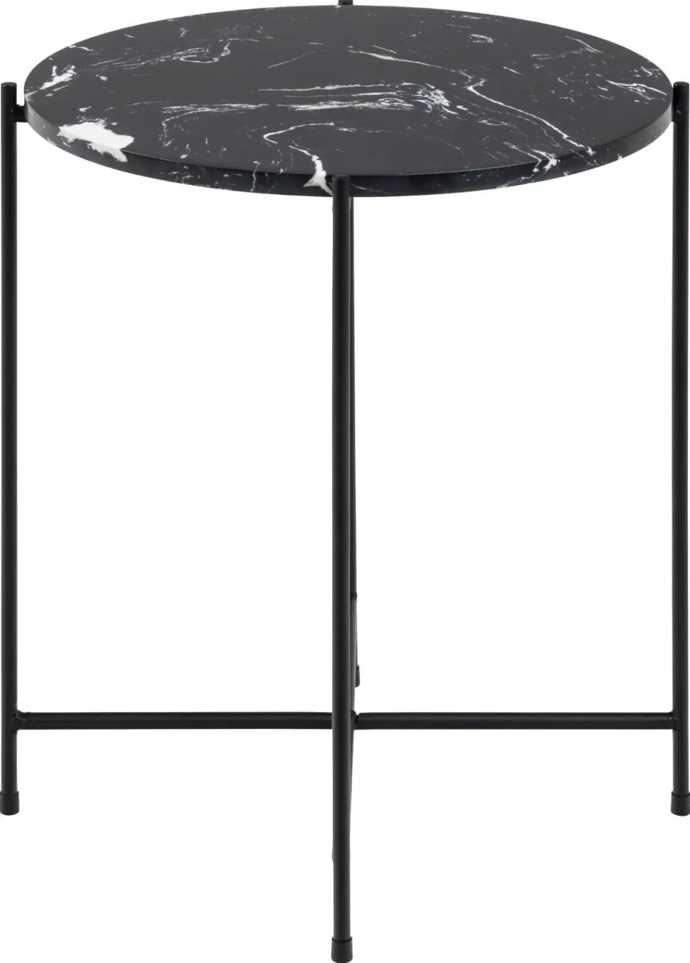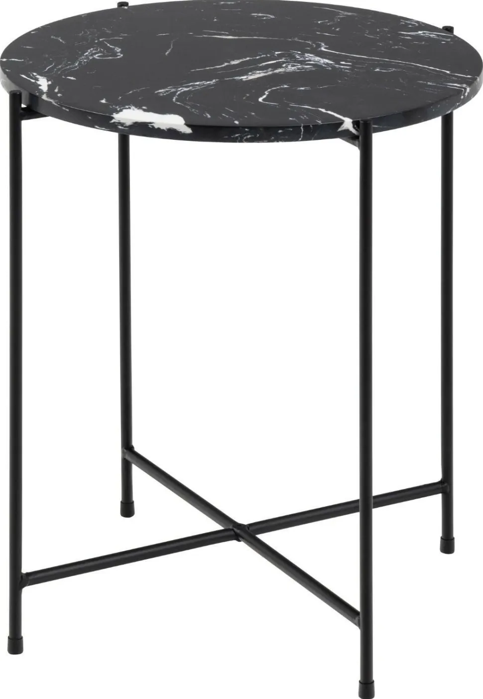 Posiada okrągły blat z brązowego marmuru oraz malowaną proszkowo podstawę złożoną z czterech nóg w kolorze czarnym. Nogi stolika zabezpieczone są nakładkami z tworzywa sztucznego i połączone dodatkowo dwoma krzyżującymi się elementami. Całość sprawia wrażenie bardzo lekkiej i delikatniej, jednak odpowiednia konstrukcja sprawia, że stolik jest w pełni stabilny. Żyły o różnych odcieniach, które biegną przez polerowany kamień, czynią z ze stolika arcydzieło, ponieważ nie ma dwóch takich samych – dzięki uprzejmości natury. Jeśli potrzebujesz mebla na lata, to trafiłeś idealnie! Marmur to bardzo trwały materiał, który dodatkowo łatwo utrzymać w czystości.