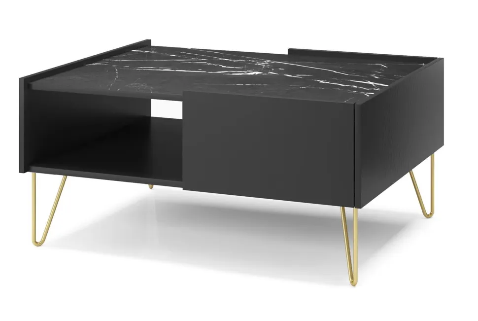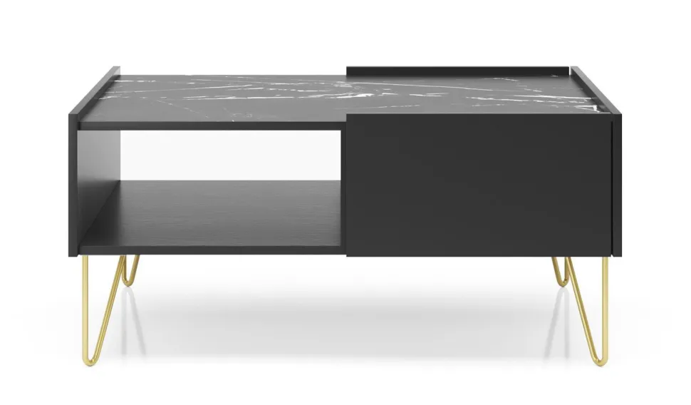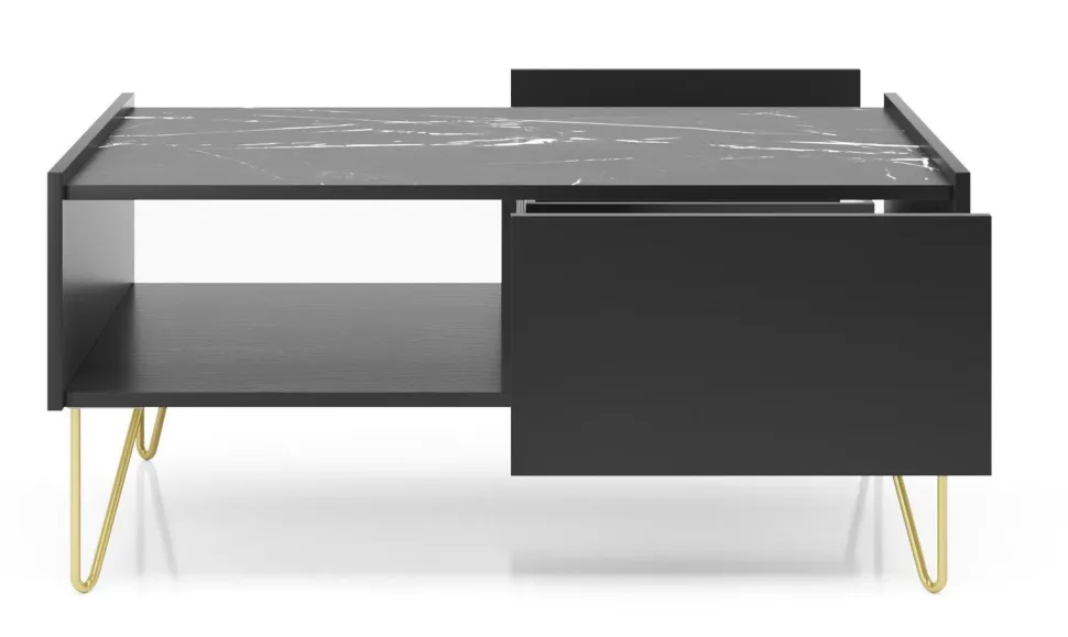 Czarny stolik kawowy Marbren ma elegancki wygląd, który będzie uzupełnieniem każdego nowoczesnego salonu. Posiada czarny blat imitujący marmur, metalowe nogi w kolorze złota oraz głęboką szufladę do przechowywania. Stolik to jeden element kolekcji Marbren, kup inne meble z tej samej serii i urządź swój dom w jednolitym stylu!
