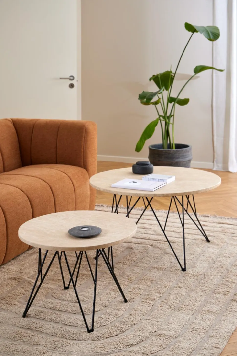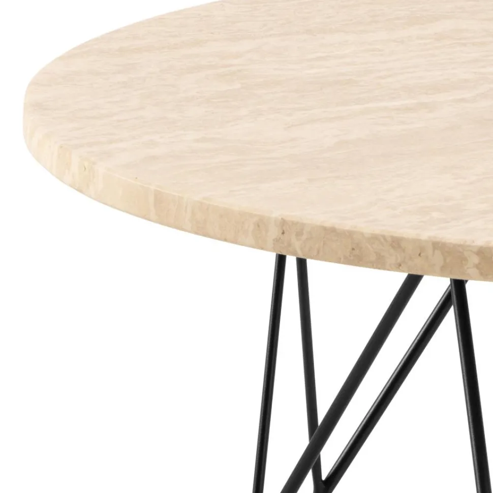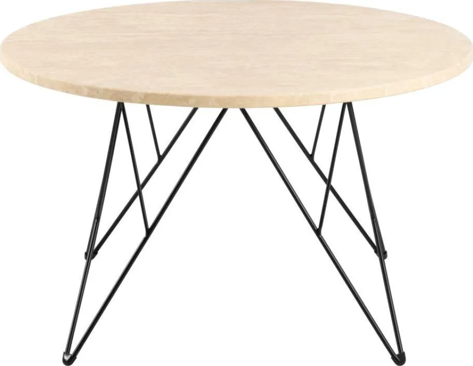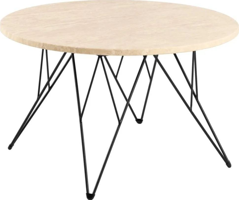 ]=Stolik kawowy Prunus 80 cm trawertyn/czarny to wyjątkowy element wyposażenia wnętrz, który łączy elegancję naturalnego kamienia z nowoczesnym designem. Okrągły blat wykonany jest z lakierowanego trawertynu o matowej, beżowej powierzchni, co nadaje mu delikatny, ale wyrazisty wygląd. Trawertyn, jako naturalny kamień, wprowadza do wnętrza ciepło i organiczny charakter, a jednocześnie jest trwały i łatwy w pielęgnacji dzięki lakierowanemu wykończeniu.