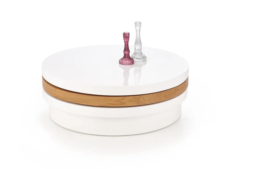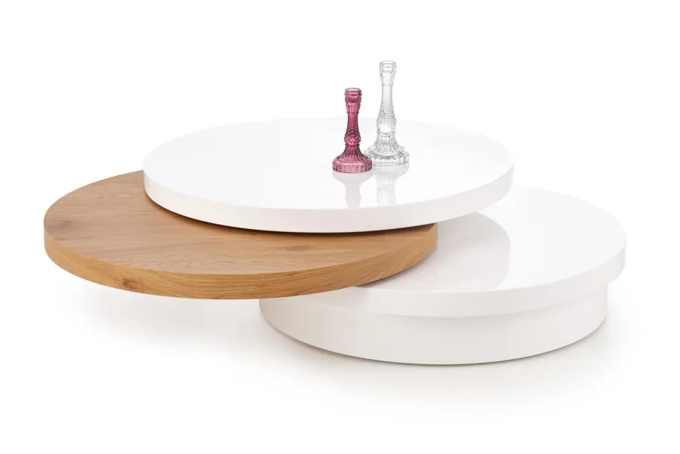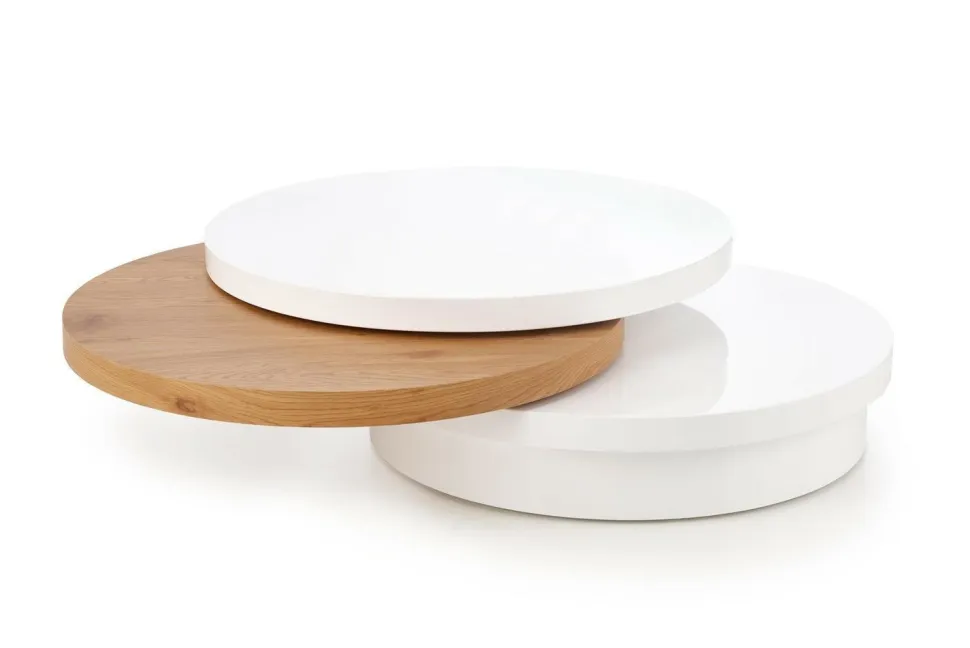 Stylowy stelaż z mdfu w kolorze białym dodaje mu lekkości i subtelności.Stolik kawowy Pug posiada okrągły blat, który jest wykonany z MDF okleinowanego i MDF lakierowanego. Dzięki temu jest nie tylko estetyczny, ale także łatwy do utrzymania w czystości. Dodatkową funkcjonalnością tego stolika jest rozkładany blat, który pozwala na zwiększenie powierzchni użytkowej w razie potrzeby.