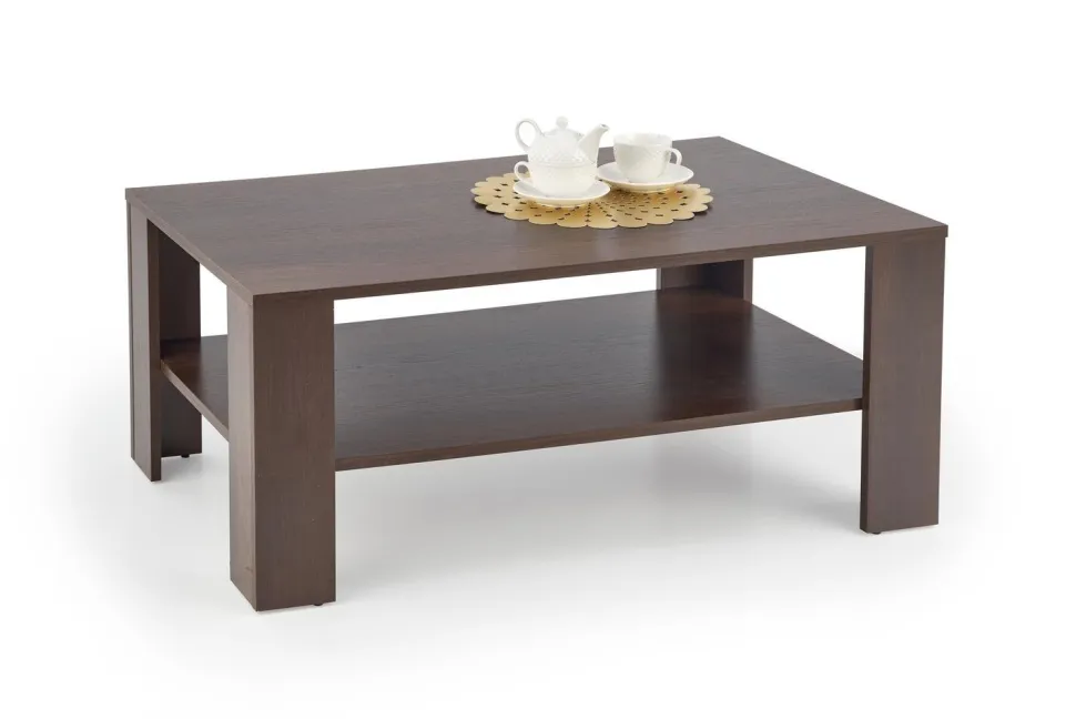 Przedstawiamy stolik kawowy Tastur, idealny dodatek do każdego nowoczesnego salonu! Solidny i stylowy, tradycyjny stolik z ciemną ramą w kolorze orzecha idealnie wpasuje się w każdy wystrój. Wykonany z wysokiej jakości laminatu MDF, stolik kawowy z łatwością wyróżnia się ponadczasowym designem i solidną konstrukcją, zapewniając luksusowy wygląd, który trwa. Dolna półka zapewnia dodatkową stabilność i idealne miejsce do przechowywania książek lub czasopism. Dzięki prostokątnemu kształtowi, szerokości 110 cm i wysokości 53 cm, elegancki stolik kawowy z pewnością przypadnie do gustu. Spraw, aby Twój dom był kompletny i dodaj mu wyrafinowania dzięki stolikowi kawowemu Tastur już dziś!