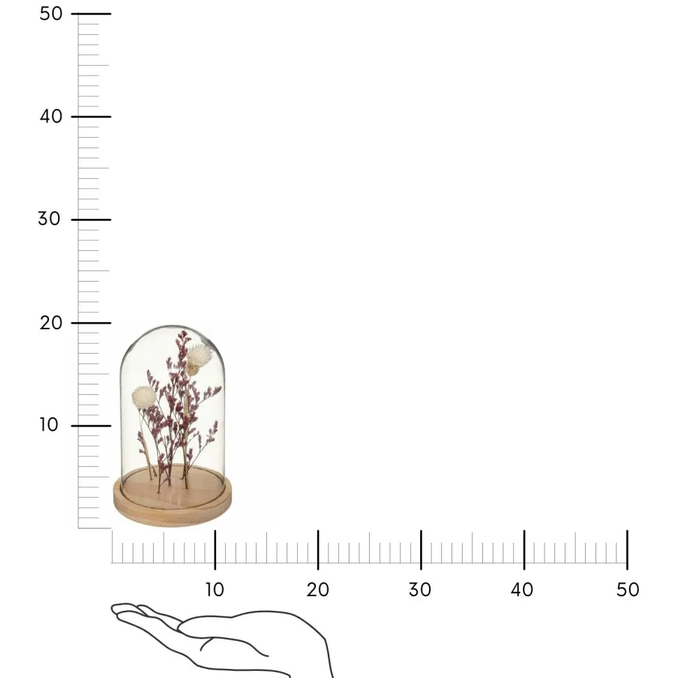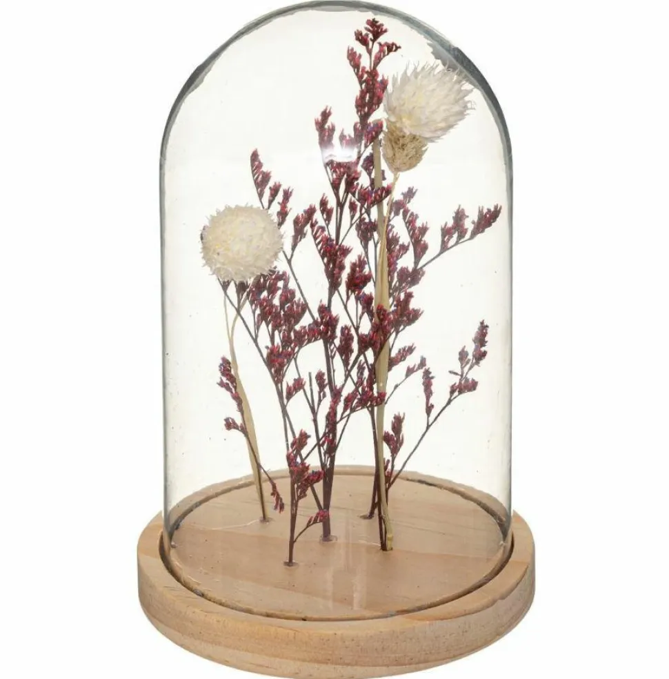 Kompozycja z suszonych kwiatów pod szklanym kloszem stanowi piękną i ciekawą dekorację każdego naturalnego wnętrza. Dekoracja umieszczona na drewnianej podstawie jest wykonana z suszonych roślin i szkła, a jego waga wynosi 0,307 kg.