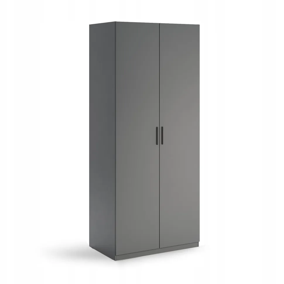 Materiał wykonania to wysokiej jakości płyta wiórowa laminowana, matowa w kolorze grafitowym, co gwarantuje trwałość i stabilność konstrukcji. Każde drzwiczki wyposażone są w cztery zawiasy o podwyższonej wytrzymałości, co zapewnia stabilność całej szafy.
